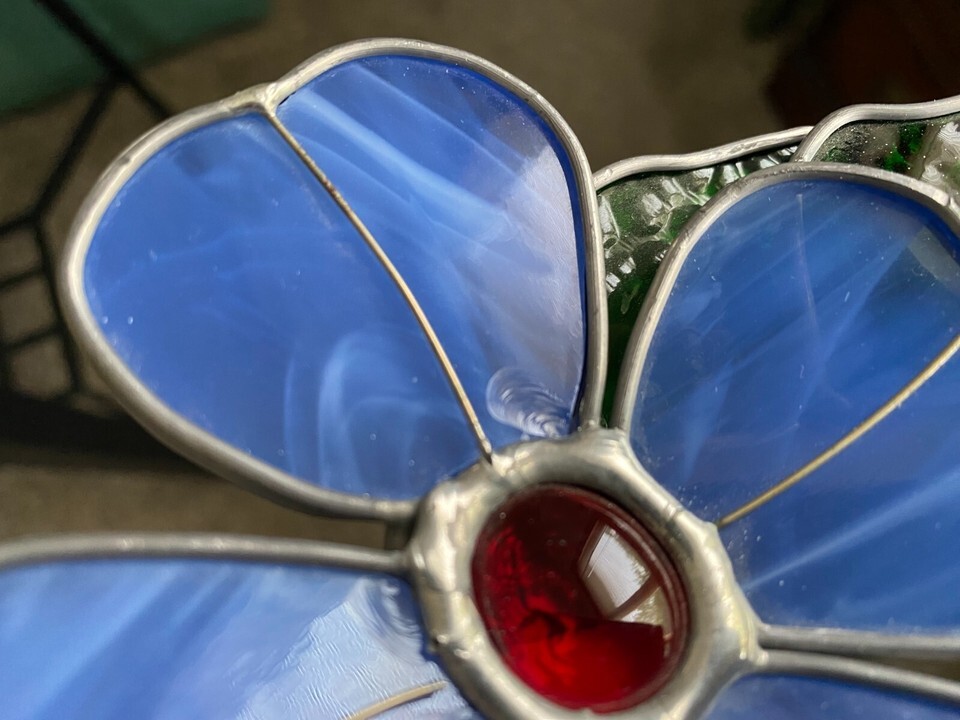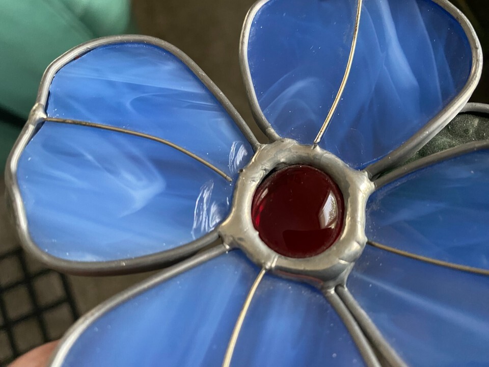 Vintage TIFFANY Stained Glass BLUE Flower Suncatcher READ