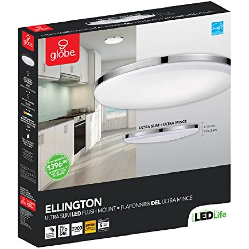 Perfect to use as a living room light fixture, Closet Light, hallway, basement or den, Globe Electric ellington flushmount ceiling light is a great addition to any space. Energy star certified with an integrated LED, this flush mount will ensure you will not have to change your fixture for 45 years and will save you 396 dollars in energy costs over the lifetime of the light. an Ultra slim design mixes with a contemporary finish to keeps it close to the ceiling and always in style. Fully dimmable, you can control the amount of light you have at any given time to create the perfect atmosphere for any situation. Includes a 5 year manufacturer's limited warranty so you can enjoy your light for years to come.