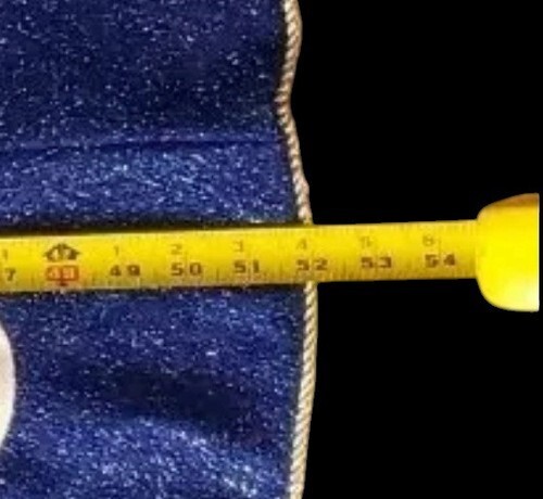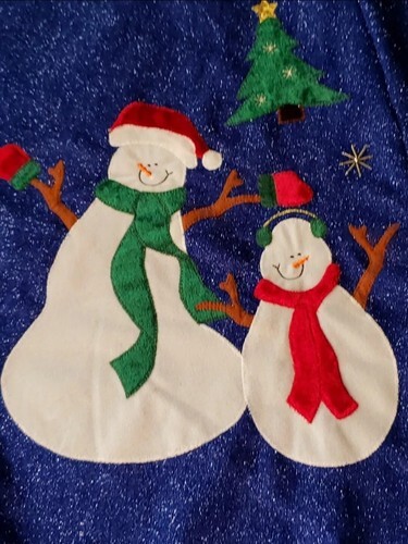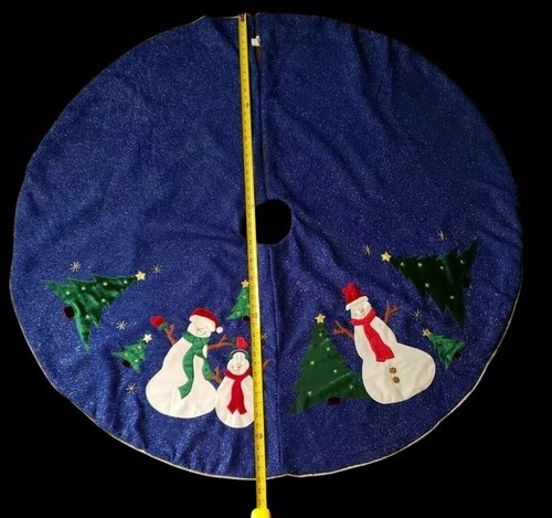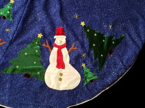 Beautiful blue Christmas tree skirt featuring a cheerful ?Let It Snow? snowman theme with sparkling fabric that catches the light beautifully.