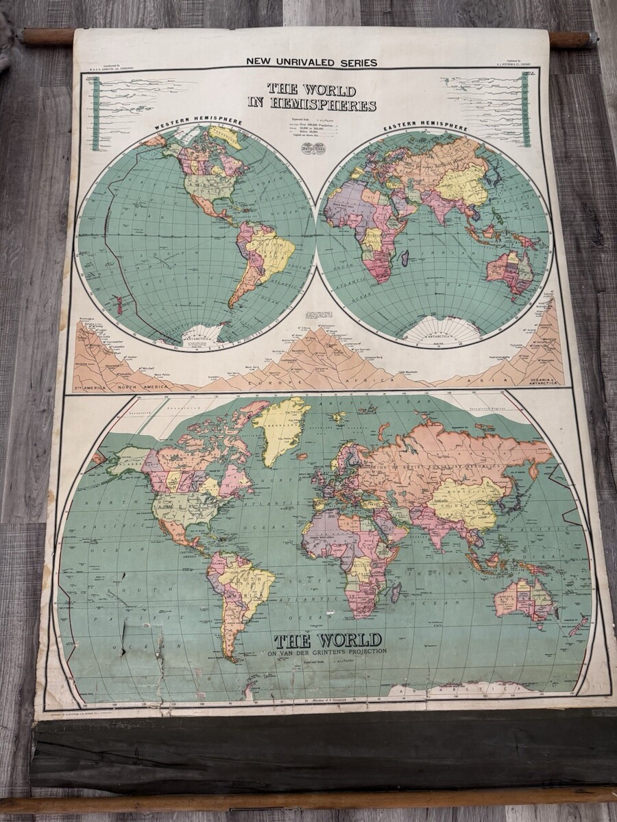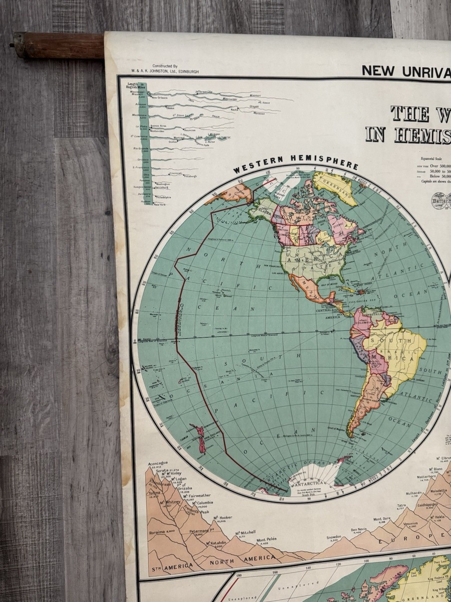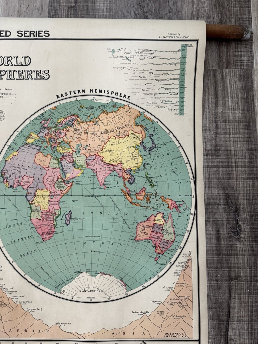 Vintage Johnston-Nystrom Pull-Down School Map The World In Hemispheres Globe