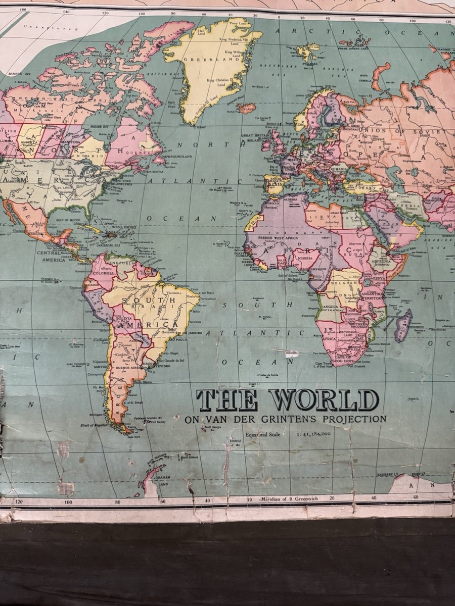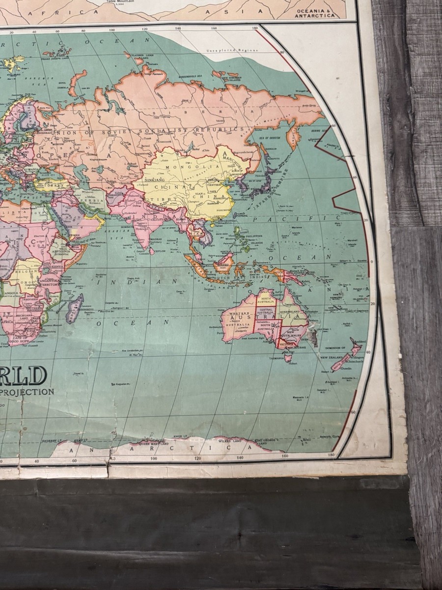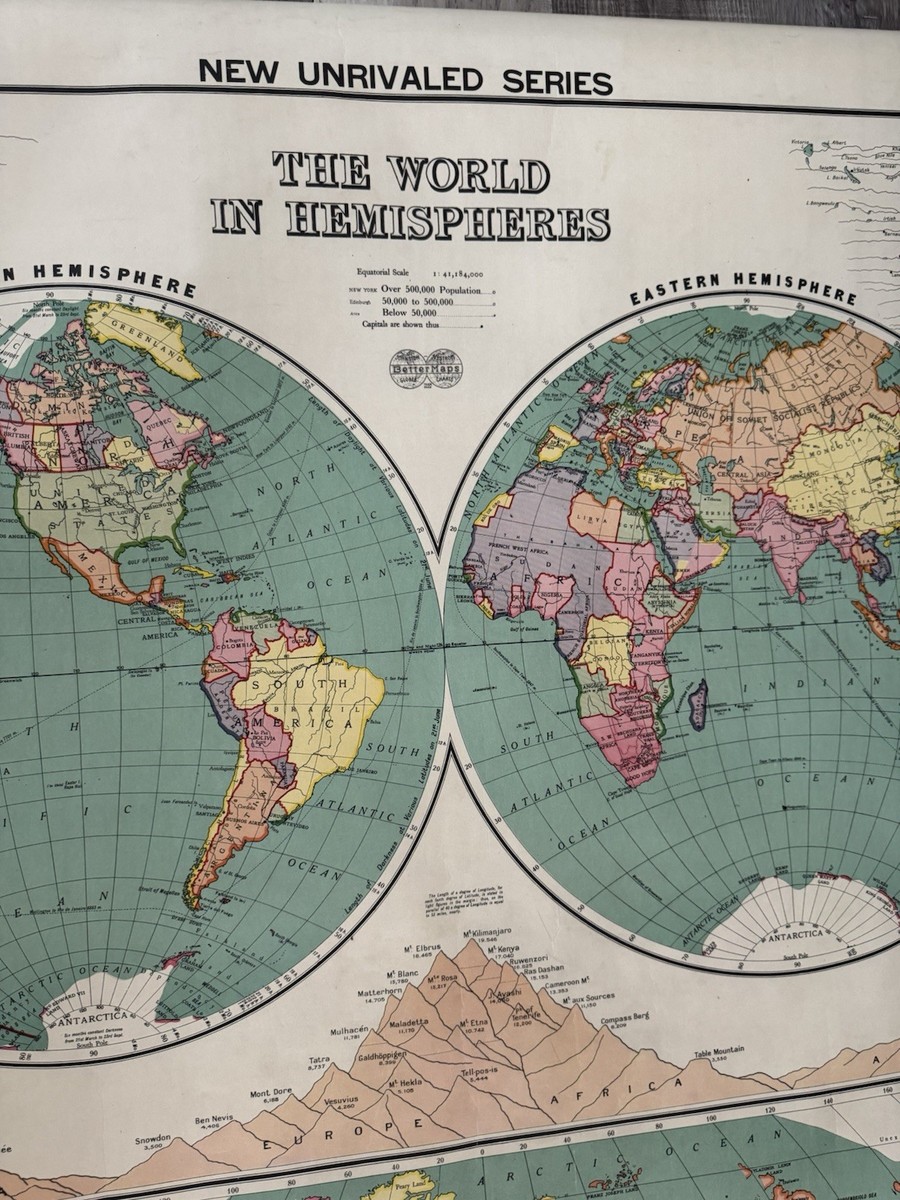 Vintage Johnston-Nystrom Pull-Down School Map The World In Hemispheres Globe
