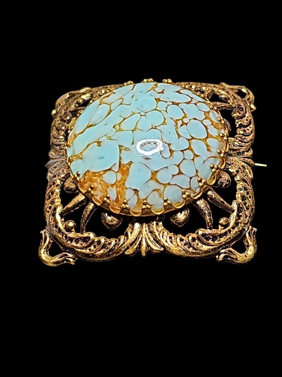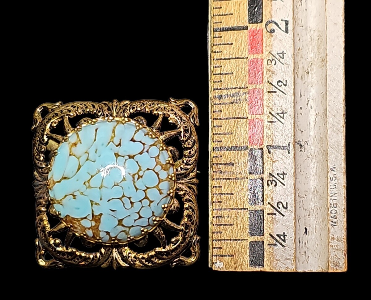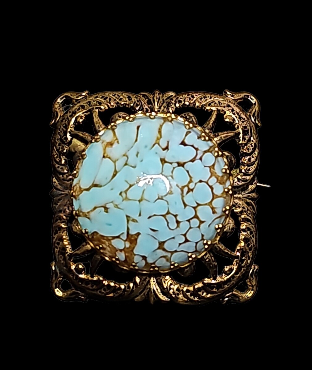 Vintage West Germany Filigree Brooch Faux Turquoise Matrix Gold Tone