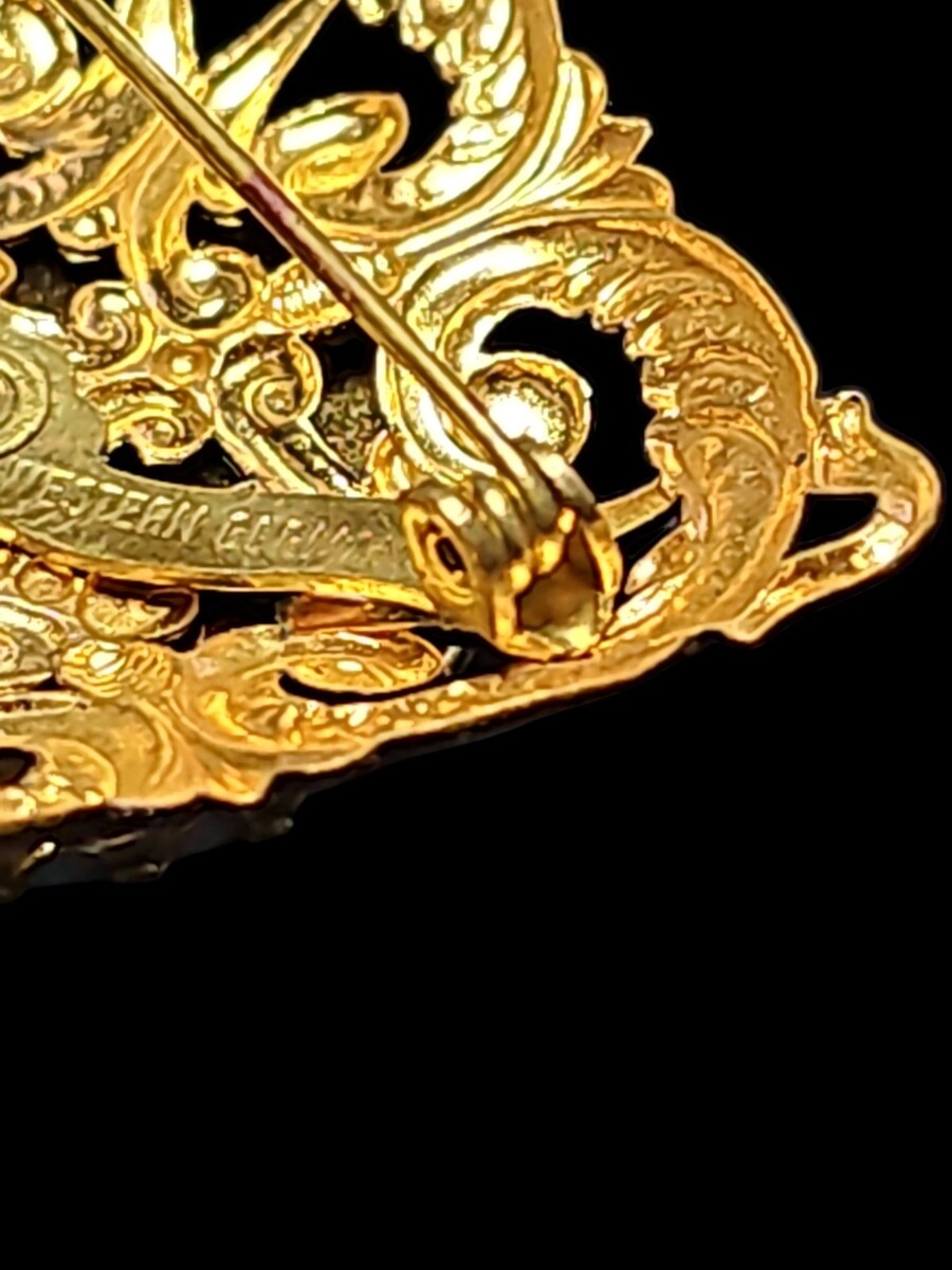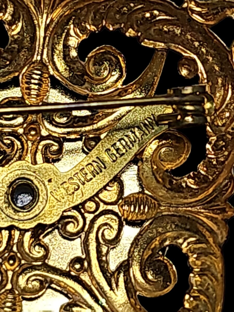 This is a vintage brooch made in West Germany, dating to the mid-20th century, prior to German reunification. Jewelry marked or identified as West Germany is highly collectible and typically dates from the 1950s?1980s, a period known for bold costume jewelry and high-quality craftsmanship.