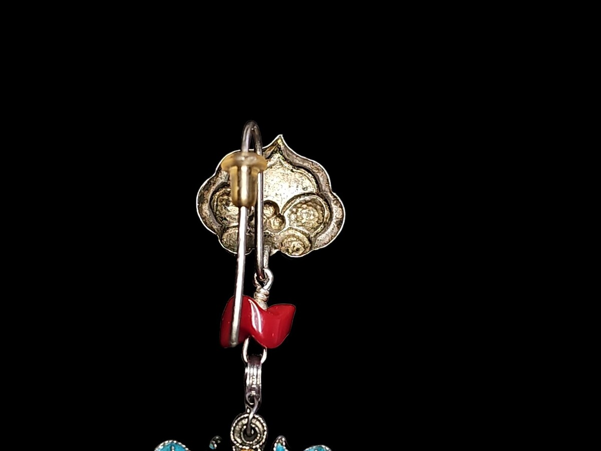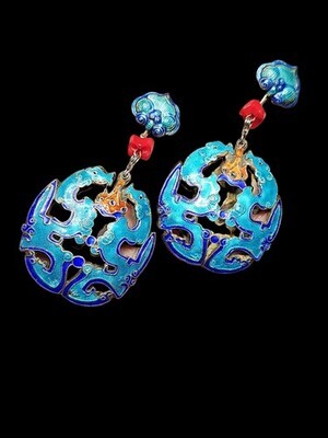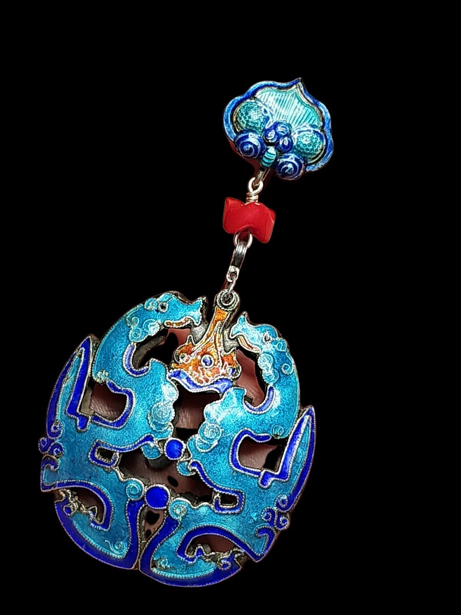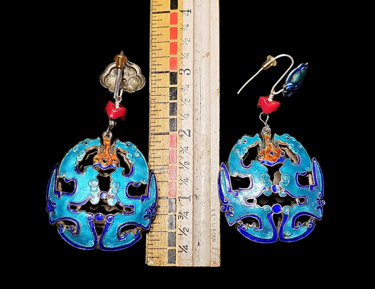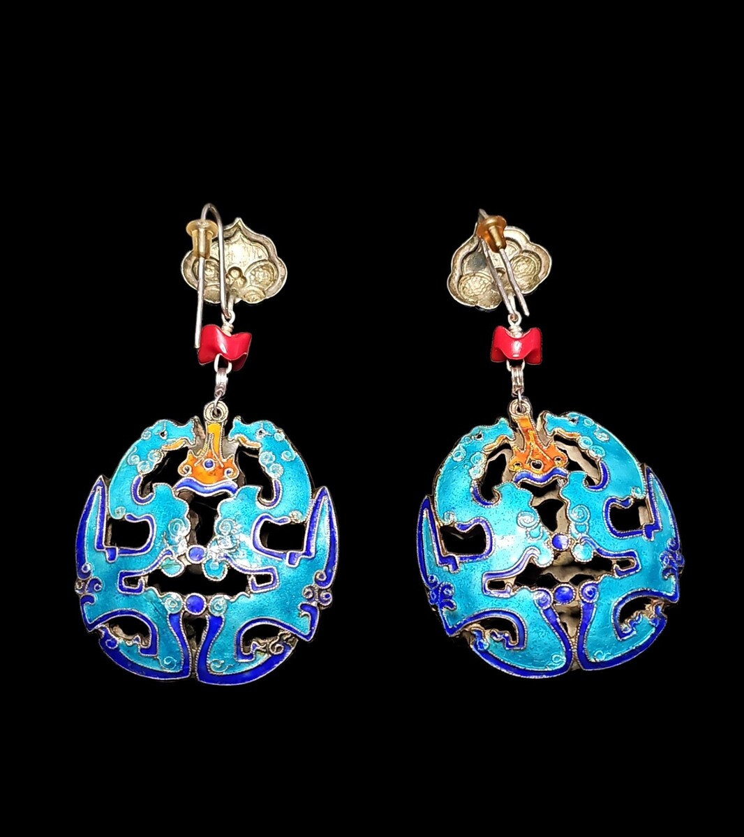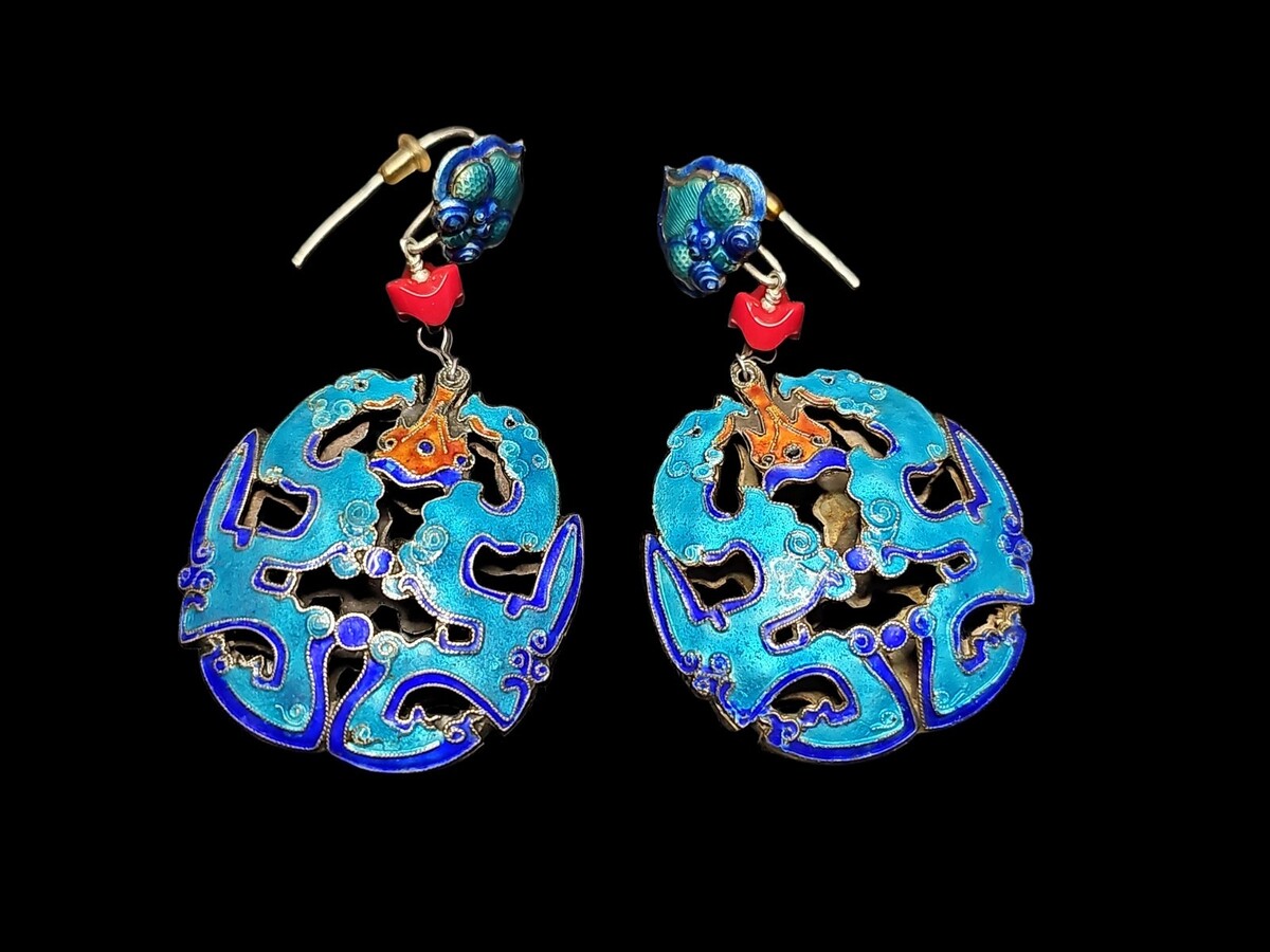 These earrings are vintage Asian export enamel chandelier earrings, featuring a bold double dragon motif in an intricate cut-out design. They come from a large, well-curated estate collection containing high-quality vintage jewelry and decorative arts accumulated over many decades.