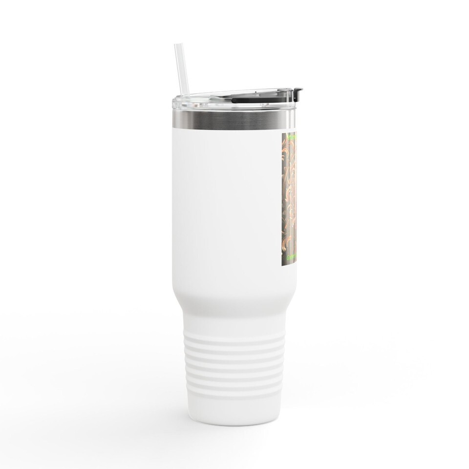 This 40oz insulated travel mug keeps long days moving and drinks exactly how you like them. Built from durable stainless steel with double-wall insulation, it holds enough coffee, tea, or iced brew to power road trips, long commutes, and full work shifts. The ergonomic handle and included straw make it easy to sip on the go, while the leak-resistant push-on lid locks in temperature and prevents spills. A powder-coated finish and UV-DTF printed artwork give each tumbler a tactile, lived-in look that stands up to outdoor use. BPA-free and made for hand washing, this tumbler blends practical performance with a design that feels personal ? bring it on hikes, mornings at the market, or marathon workdays.