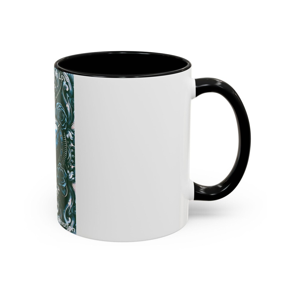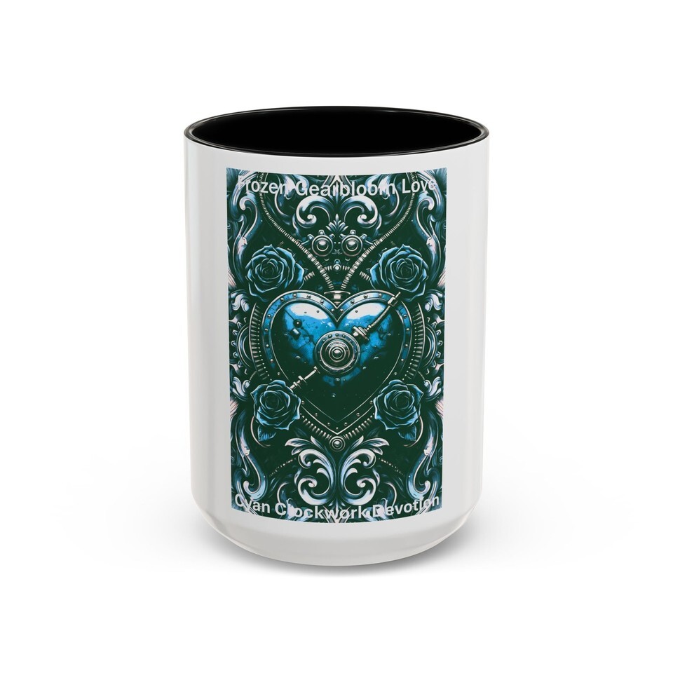 A rich, moody ceramic mug that brings a touch of gothic romance to everyday coffee and tea rituals. Deep teal and black artwork wraps around the center panel: a steampunk heart lock framed by ornate filigree and thorned roses. The glossy white exterior contrasts with the black interior and handle to make the emblem pop. Hold it on slow mornings, late-night writing sessions, or during a vinyl-listening evening ? it feels like a small, private altar for anyone drawn to dark Victorian style and mechanical nostalgia.