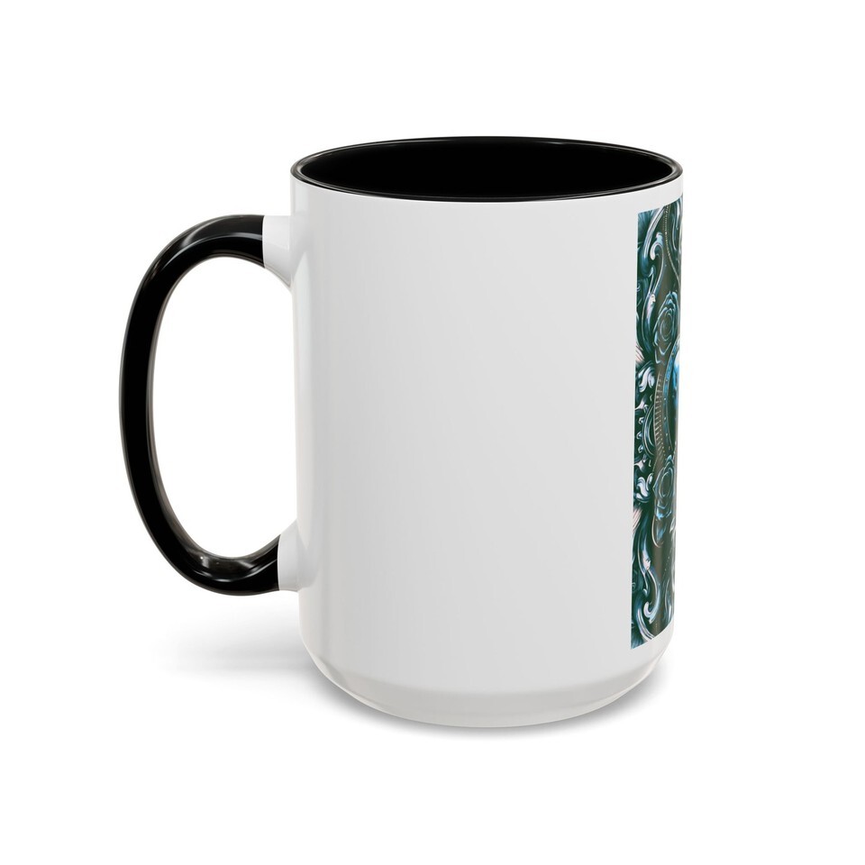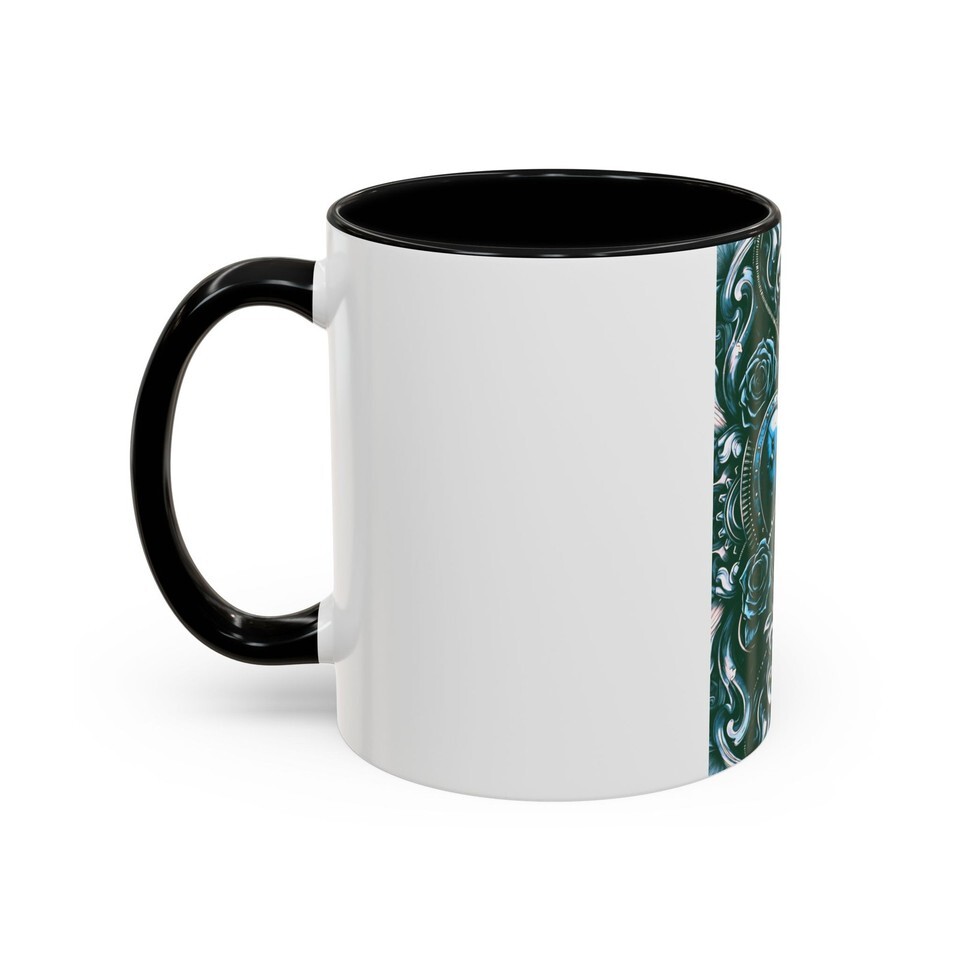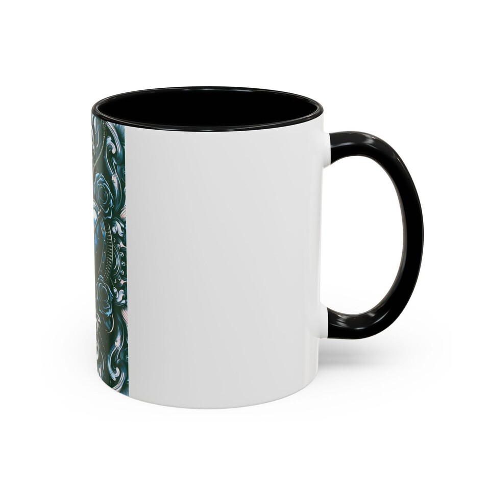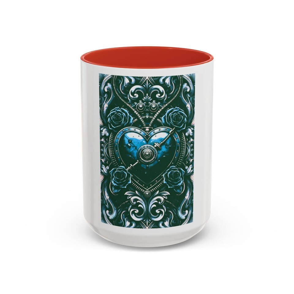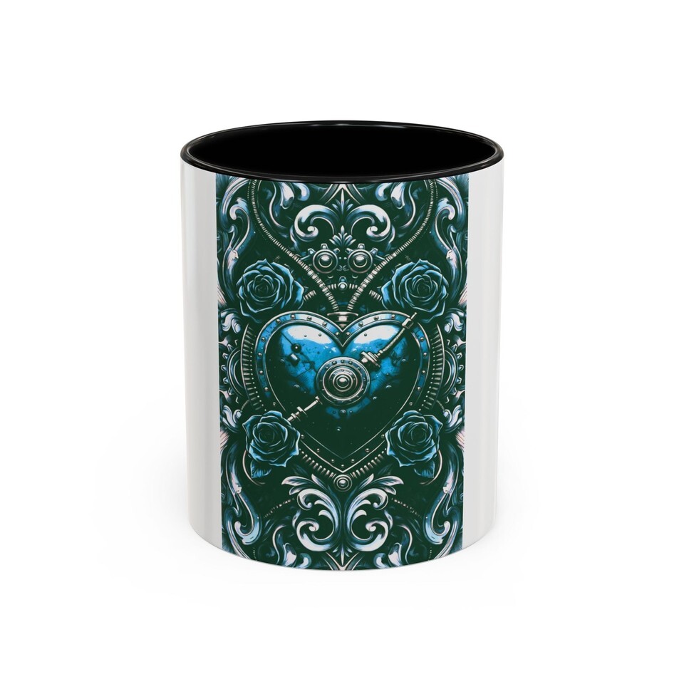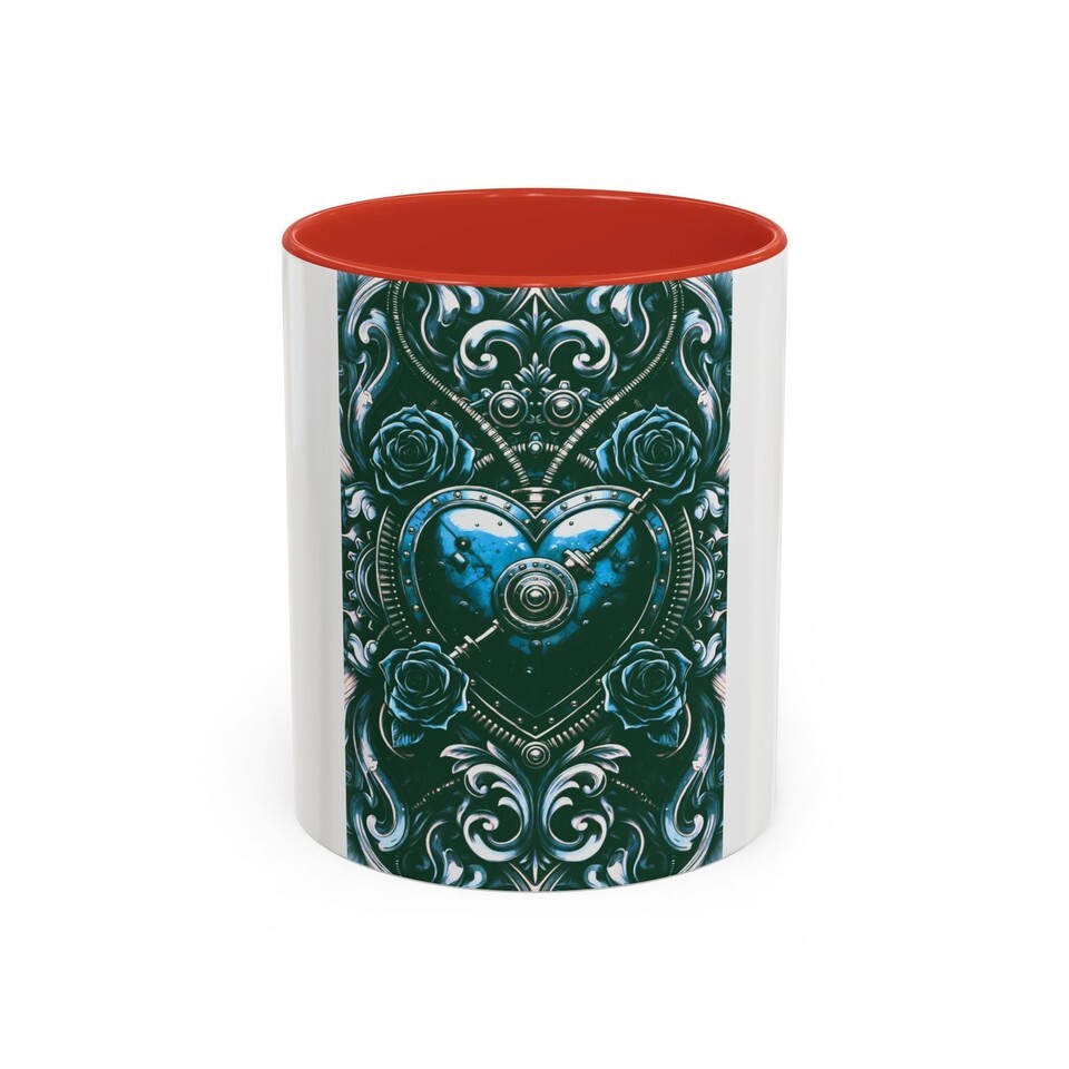 A richly detailed ceramic coffee mug that blends Victorian romance with a touch of steampunk edge. The central design features an ornate heart-shaped locket set against scrolling filigree and thorned roses, rendered in deep teal and metallic accents that pop against the glossy white body. The colored interior and handle add striking contrast and frame the artwork, turning a simple morning ritual into a small moment of beauty and attitude. Hold it while sketching, journaling, or settling into a rainy afternoon ? it feels like a quiet, wearable piece of art that fits into a creative, slightly rebellious home.