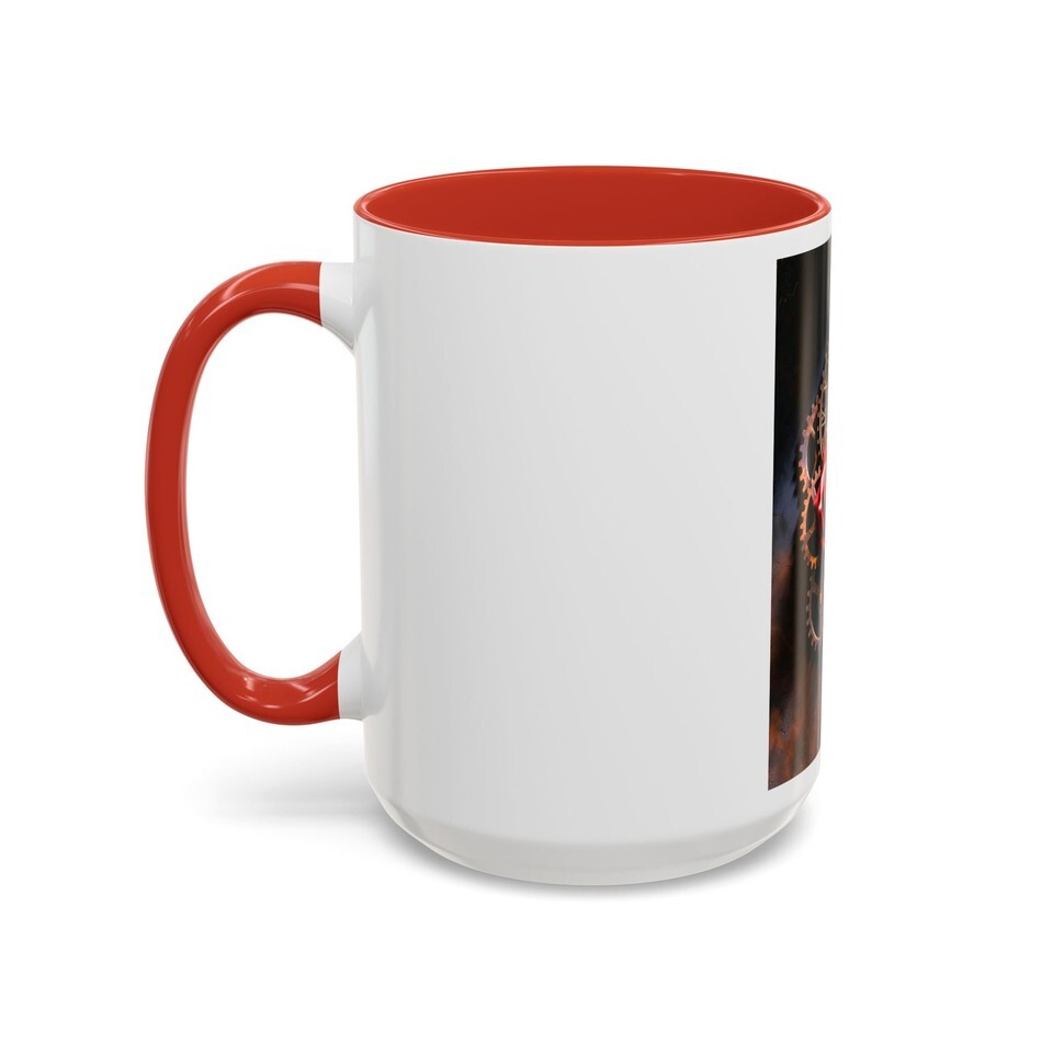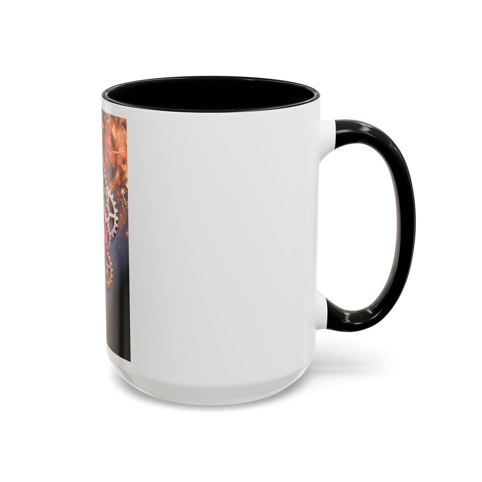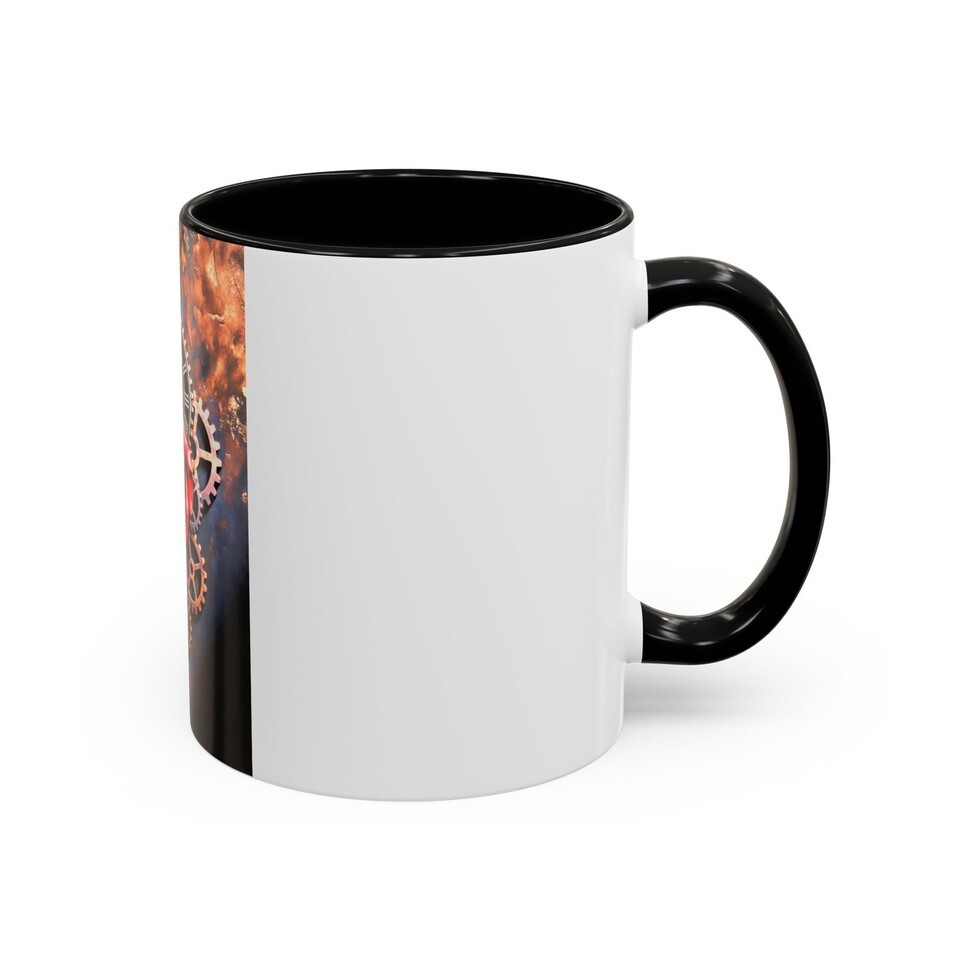Sip slow and steady from a mug that looks like it fell out of a clockmaker?s dream. Deep black glaze frames a burnished, gear-filled vignette where a single red rose blooms among brass cogs and a weathered clock face. Warm coffee heats the copper tones; steam lifts like time itself, and the glossy contrast makes every detail pop. This mug belongs on a nightstand beside a dog-eared novel, at the workbench of someone who loves mechanics and romance, or in the hands of anyone who savors moments that feel half-mechanical, half-magical.