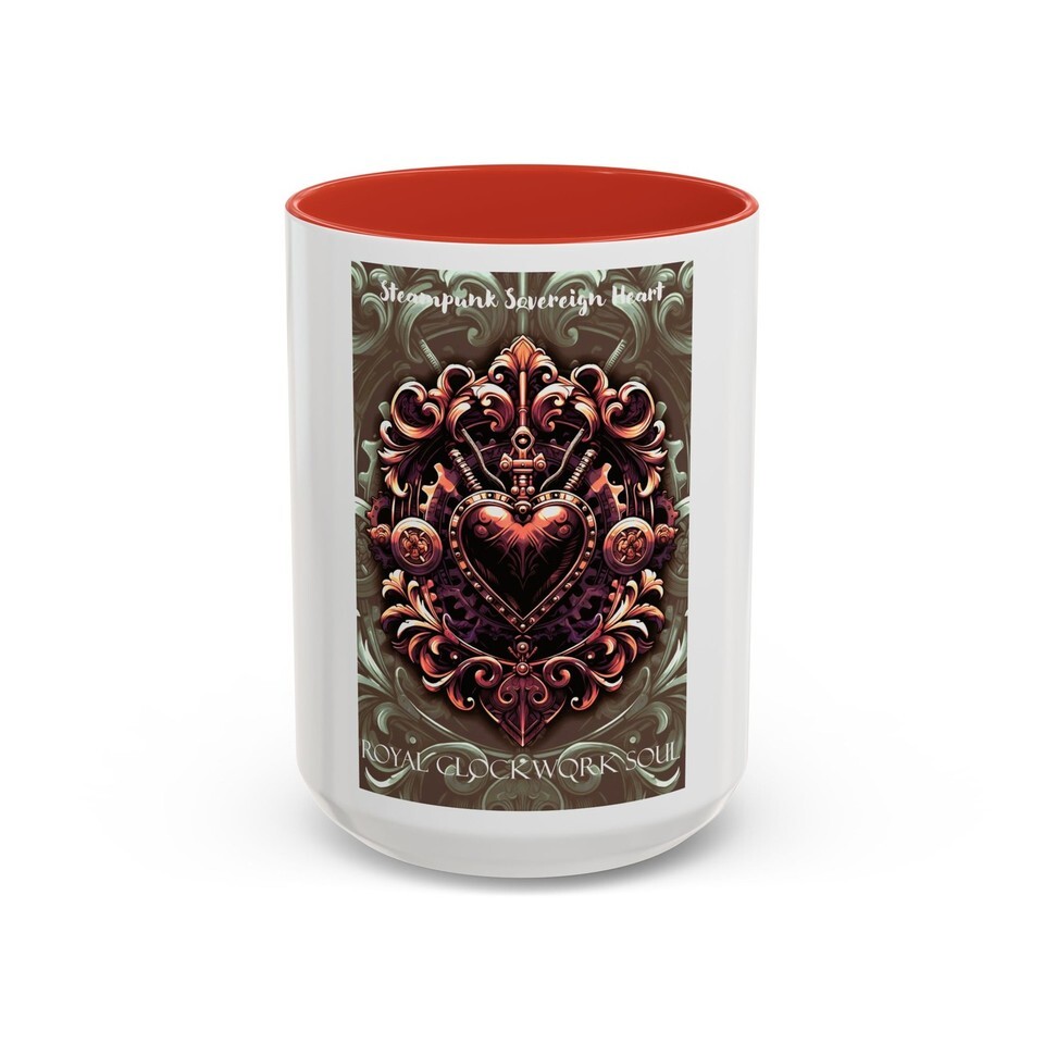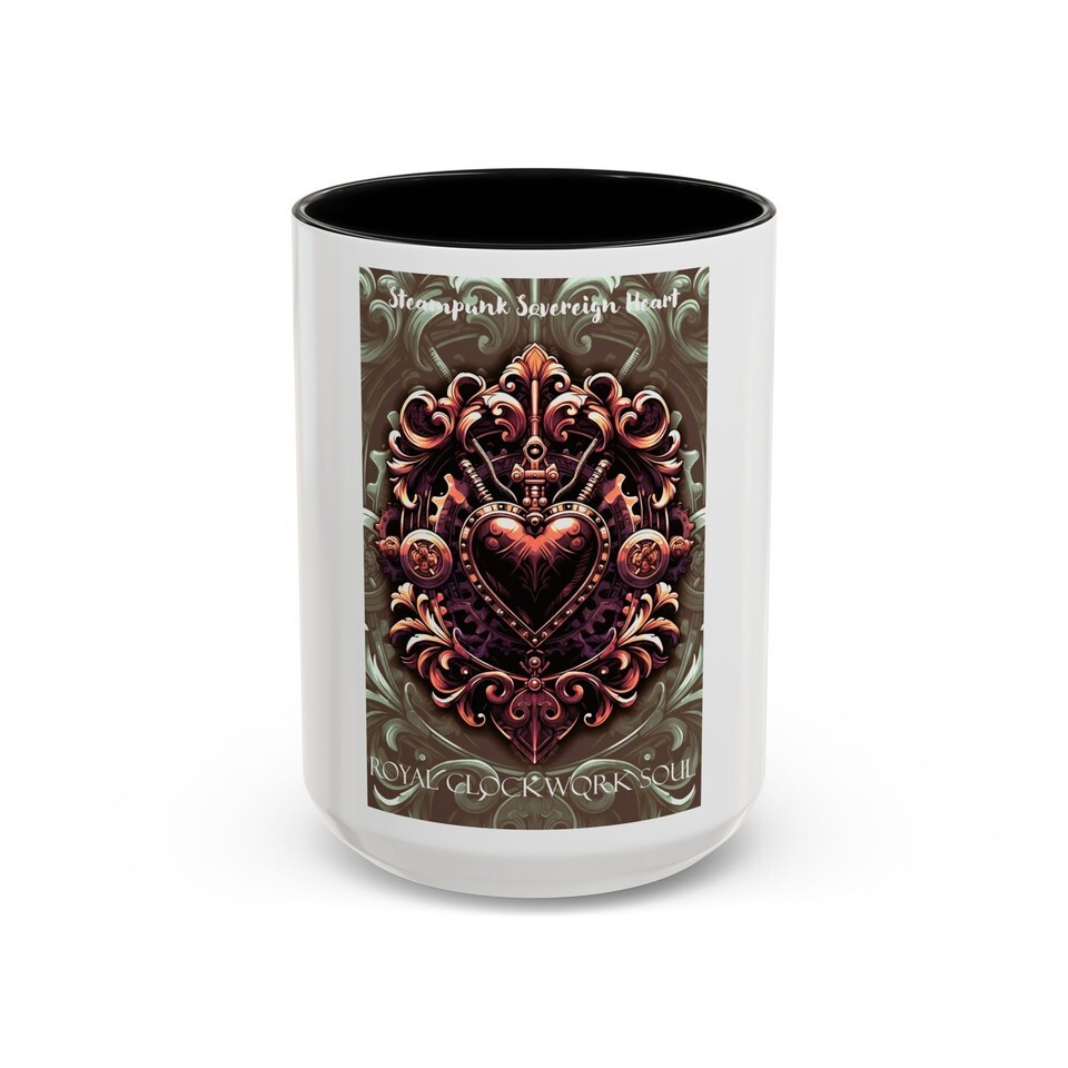 Sip slowly and let the steam carry you into a world of brass gears, filigree and old-world charm. This ceramic accent mug pairs a glossy white exterior with a rich black interior and handle, framing a detailed, heart-shaped steampunk emblem that feels like a keepsake from a curious inventor?s workshop. It?s for long mornings at a cluttered workbench, late-night brainstorming with a lamp aglow, or quiet moments reading schematics by candlelight. The contrast of deep black and warm metallic tones in the artwork makes each sip feel deliberate ? tactile, thoughtful, and a little adventurous.