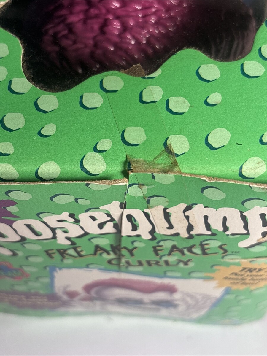The product is a vintage 1996 Goosebumps Giant Freaky Face action figure featuring the character Curly in a sealed box. This collectible item is part of the original Goosebumps franchise and is themed around the popular TV show and movie series. The boxed packaging adds to its value as a sought-after piece for fans of the horror genre and nostalgic collectors. It is a rare find from the 1990s, making it a unique addition to any action figure collection.