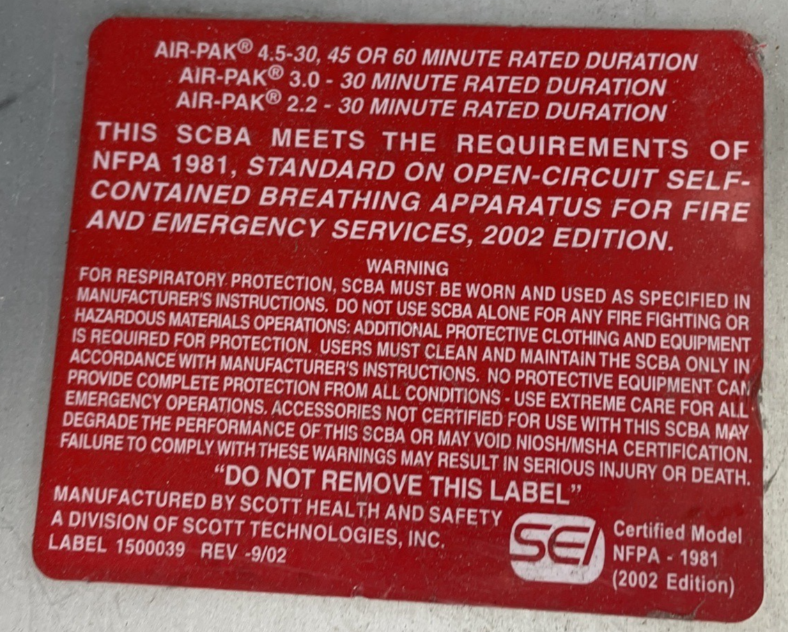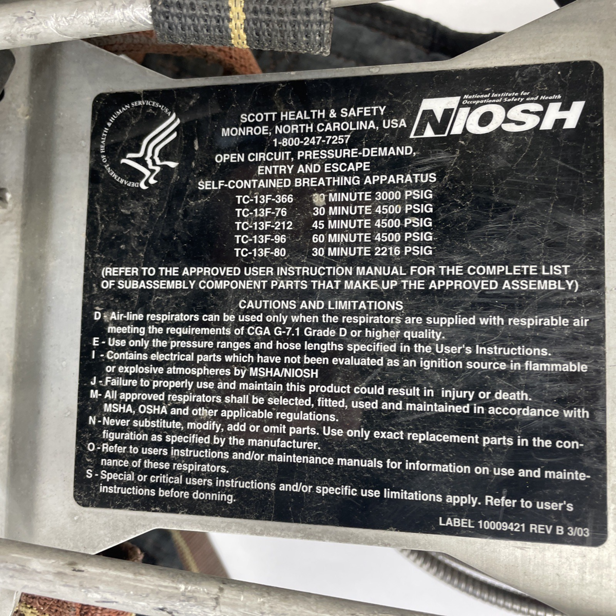 SCOTT SAFETY 4.5 4500 SCBA Air Pack Harness EZ-Flow Air Pak Plus with Sensor O
