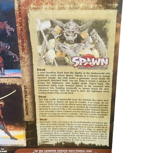This vintage McFarlane Toys Dark Ages Spawn The Samurai Wars DOJO Series 19 action figure is a must-have for any collector or fan of the Spawn franchise. The highly detailed 1:9 scale figure features the character Dojo, along with skulls and a spear.