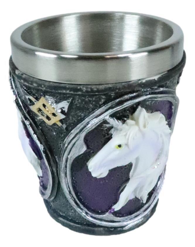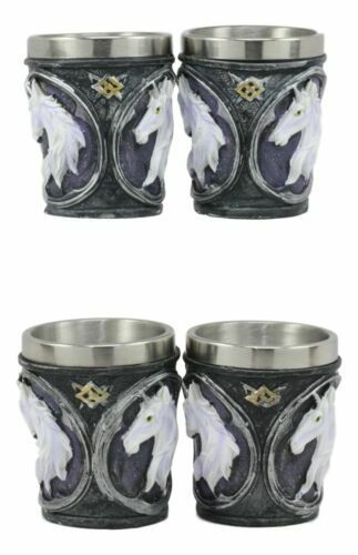 ? These Fantasy Myths And Legends Themed Sacred Unicorn Shot Glasses are made of polyresin, hand painted and polished individually. Each shot Glass is equipped with a stainless steel liner for safe drinking and washing.