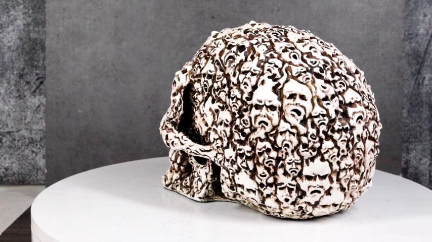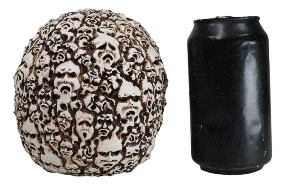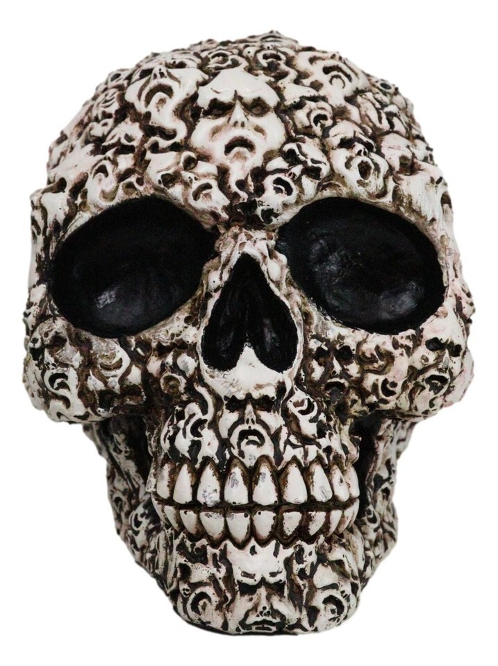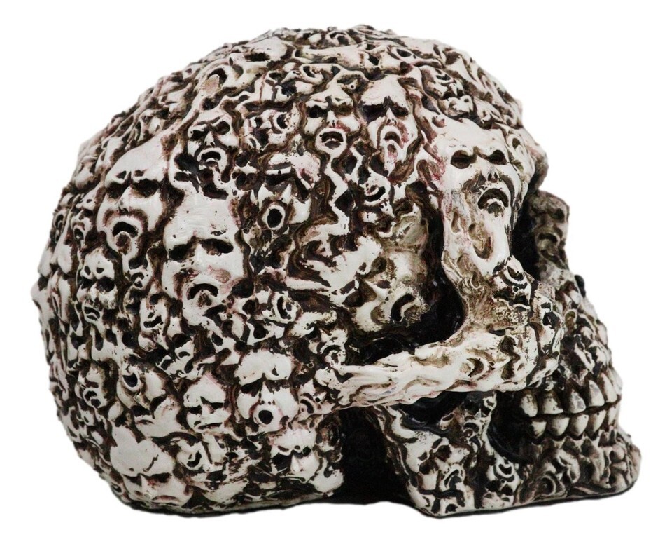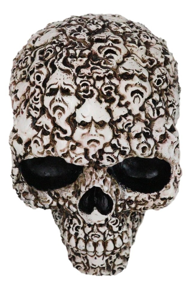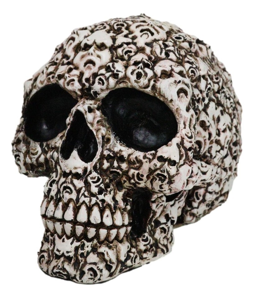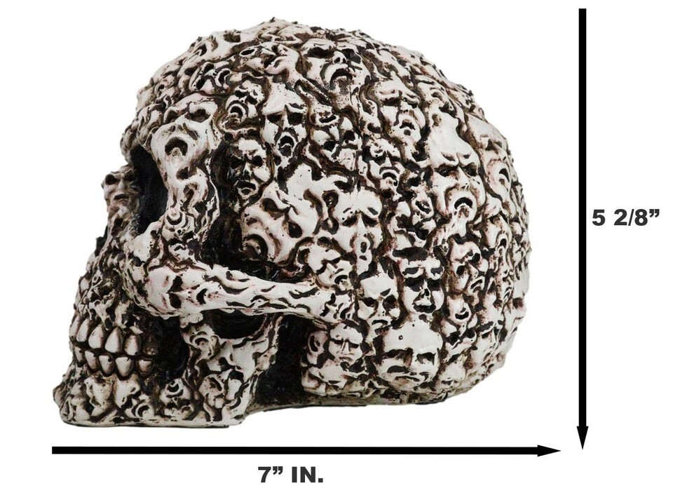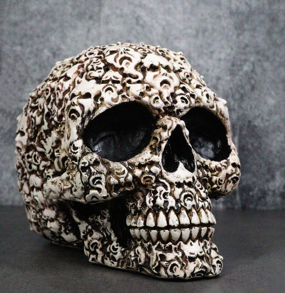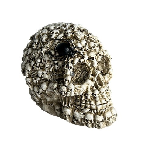 ? Eternally cursed to this condemned skull are the whispers of lost souls.... Skeletons, bones, skulls, spines and other remains of the dead fill the surface of the skull that is perhaps 'glued' together by flesh. This ossuary macabre skull will command awe and fear upon anyone that sets eyes on it.