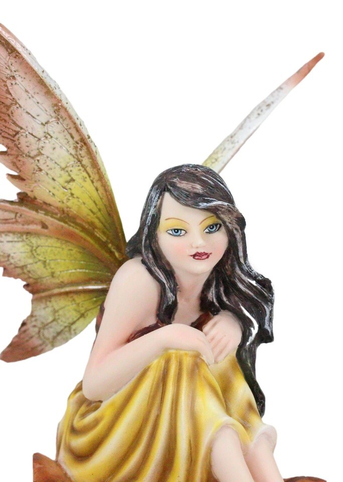 ? Beautifully dressed in autumn orange gown, this fairy represents the flora and fauna of the fall season. She features aesthetic sculpting and painting of the face and excellent details of the hair and overall body.