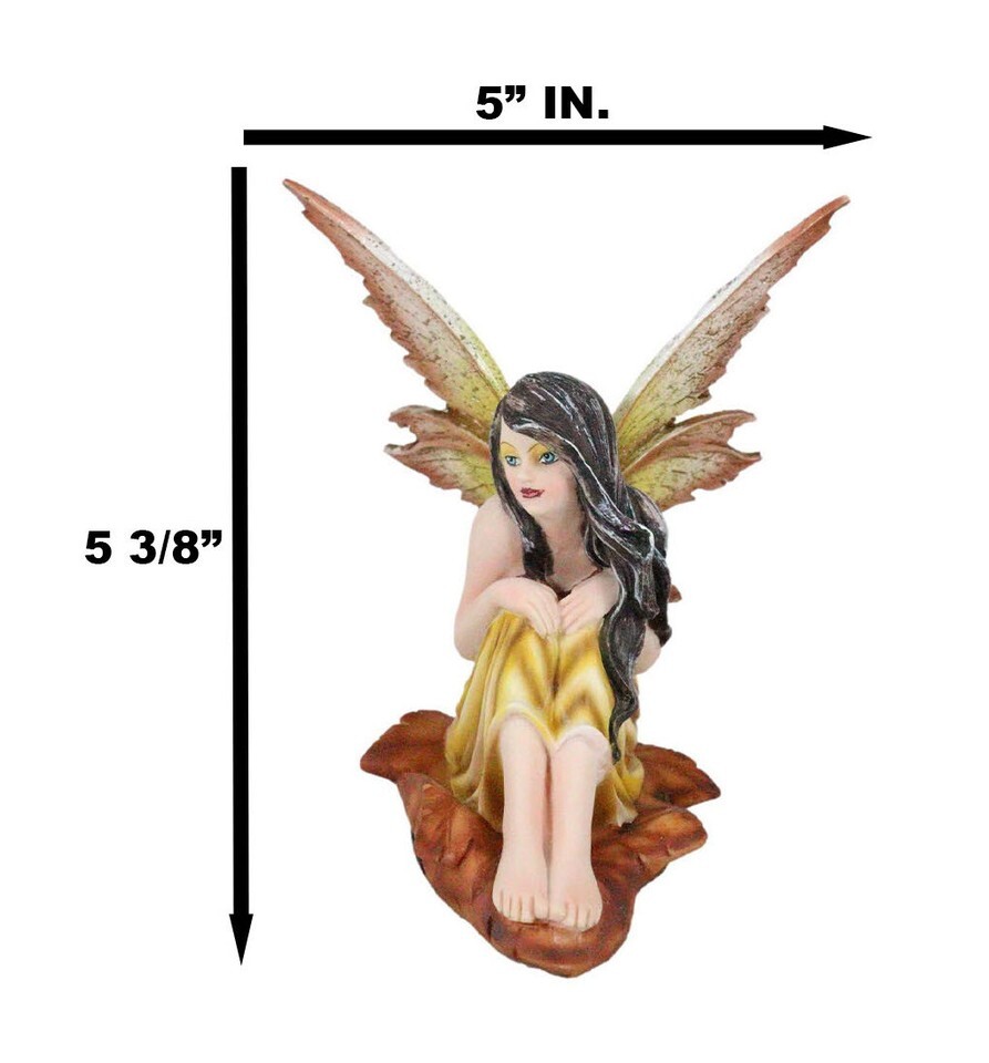 ? This Autumn fairy figurine measures approximately 5.25"tall, 5" wide and 5" deep. It weighs about 10 ounces.