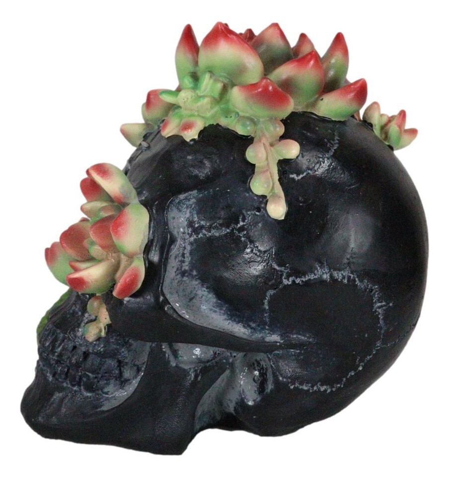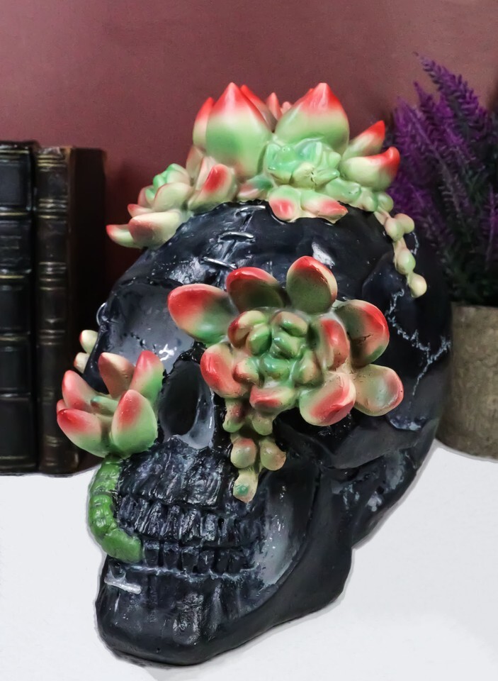 Ebros Day of The Dead Flora And Fauna Black Skull With Budding Succulents Figurine