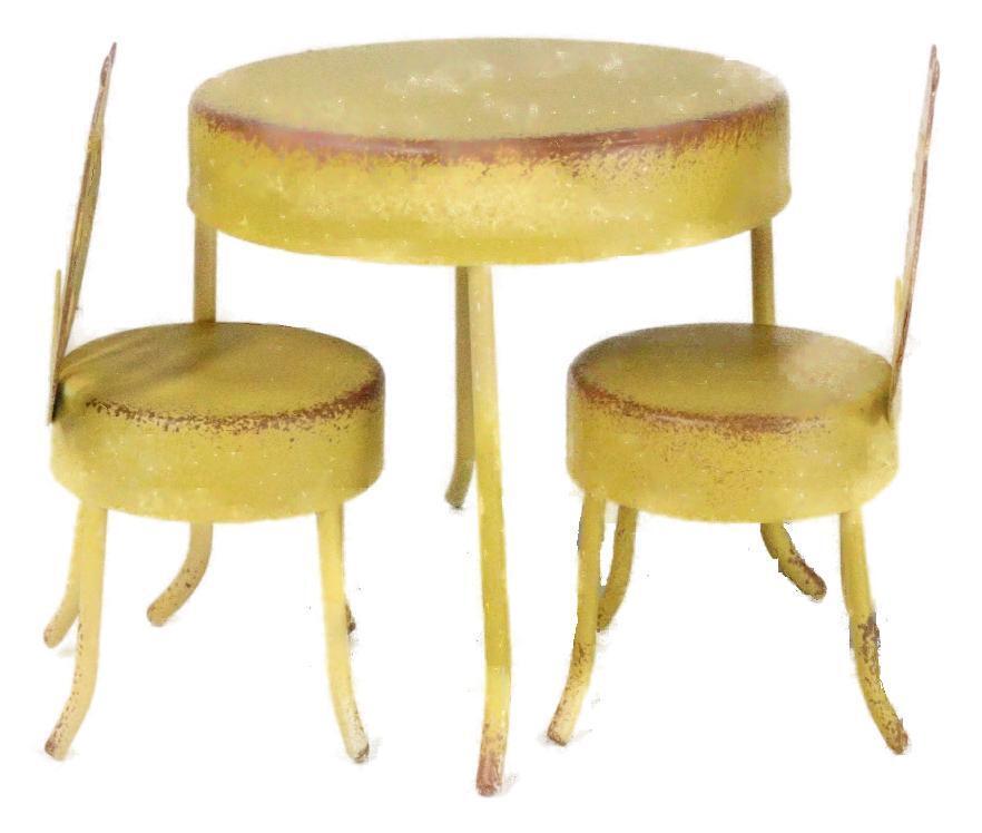 ? This Fairy Garden Miniature Table And Chairs Set is made of metal wire, hand painted and polished individually.