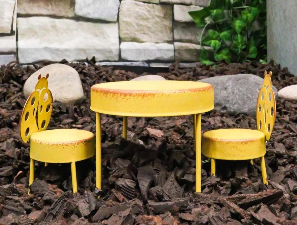 Enchanted Fairy Garden Miniature Metal Yellow Ladybug Table And 2 Chairs Set
