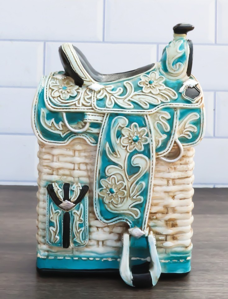 Rustic Western Turquoise Cowboy Horse Saddle With Floral Design Coin Piggy Bank