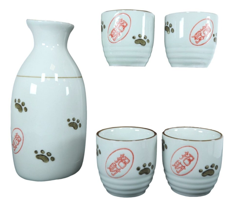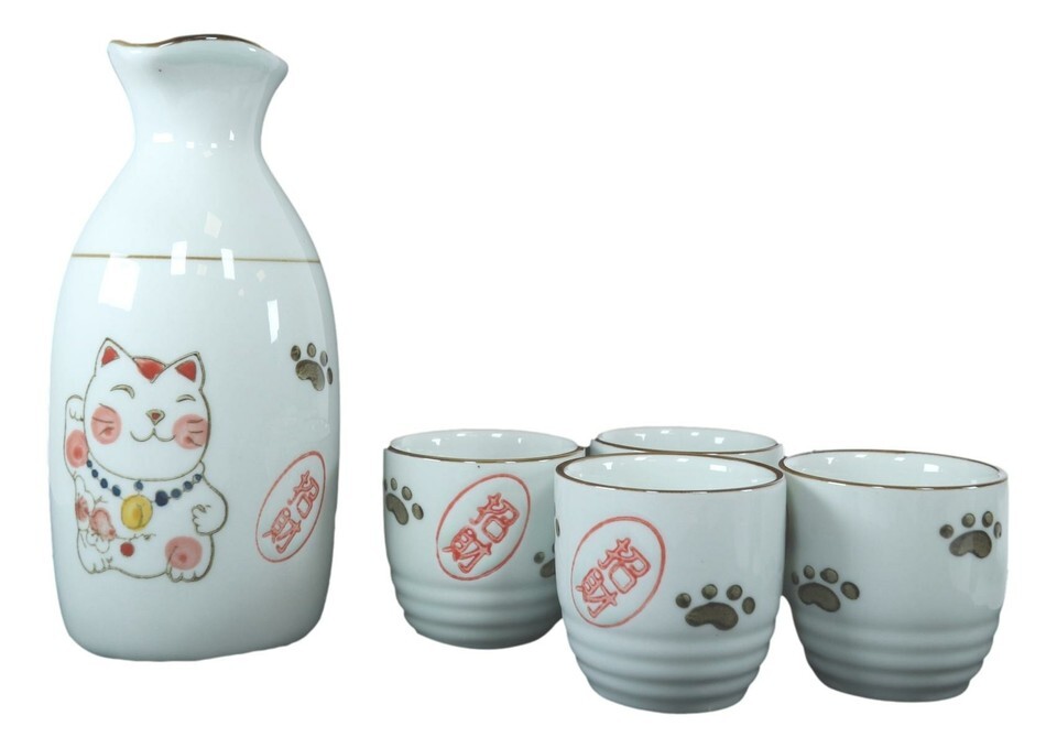 Japanese Maneki Neko Lucky Charm Cat Ceramic White Sake Set Flask With Four Cups