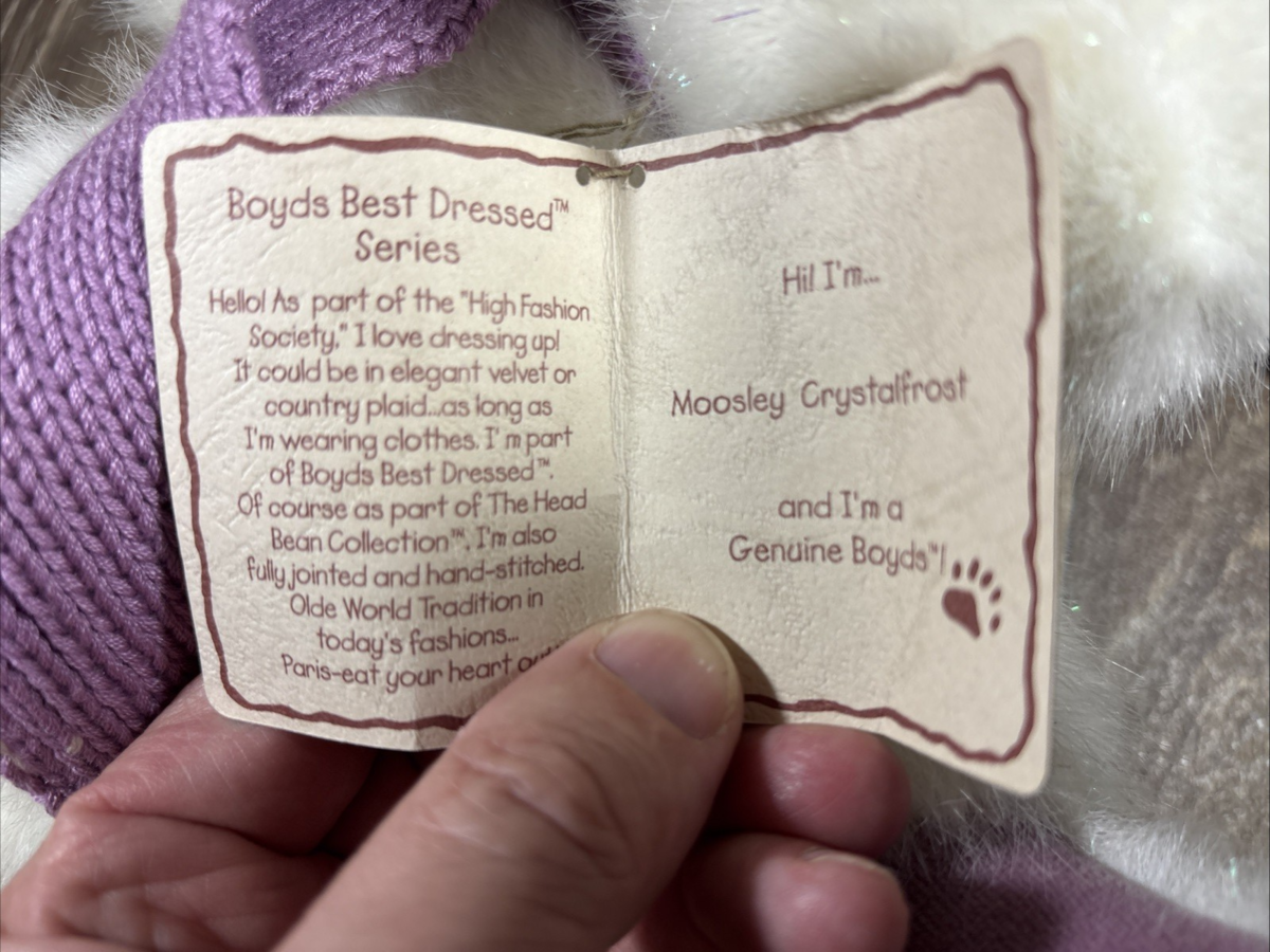 The Boyd's Bears Moosely Crystalfrost Plush Stuffed Animal Moose is a charming addition to any collection of stuffed animals. Made of plush material and featuring a realistic design of a moose, this toy is perfect for animal lovers and collectors alike. The brand's reputation for quality craftsmanship ensures a durable and adorable piece that will be treasured for years to come. Perfect for children or as a unique gift for a bear enthusiast, this moose stuffed animal is both cuddly and decorative.