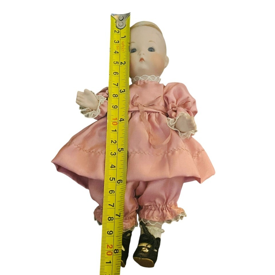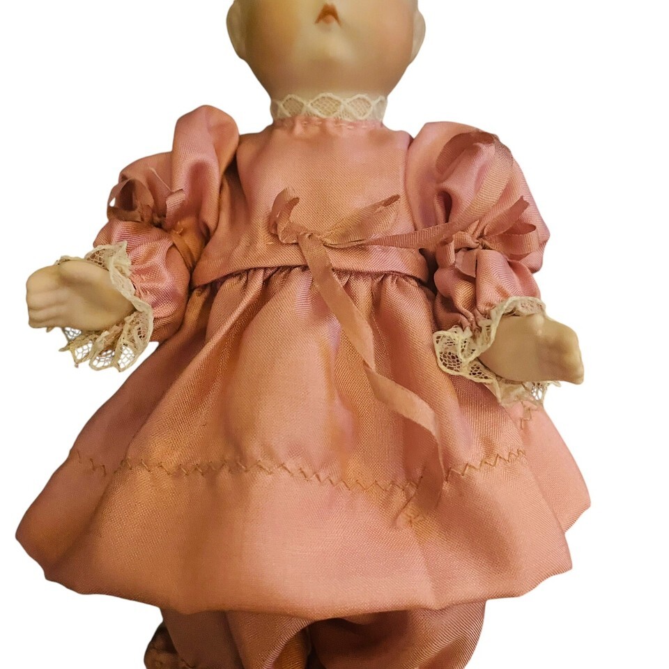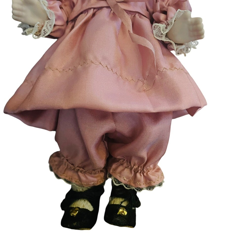 This vintage AOM 310 bisque repro Arman Marseille German jointed doll is a beautiful addition to any doll collection. The doll has a pink outfit and black shoes, and comes with a set that includes a doll, outfit, and socks and shoes. The doll is 8 inches in length and has a Caucasian complexion.