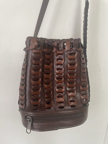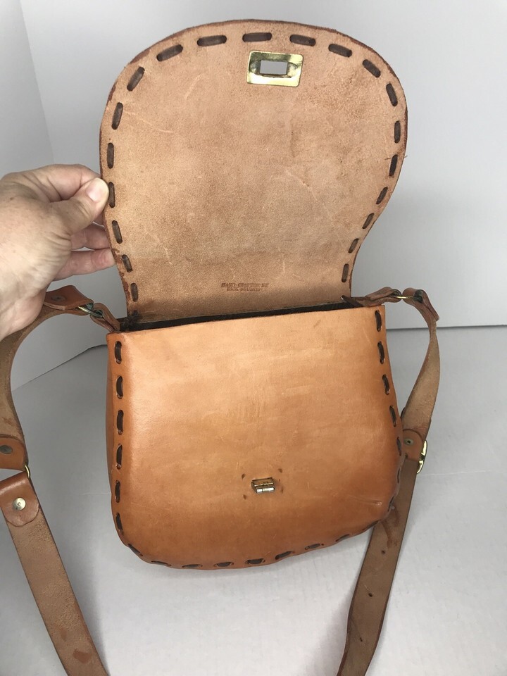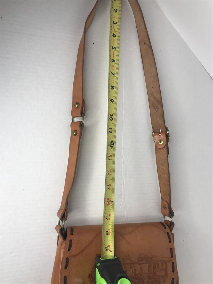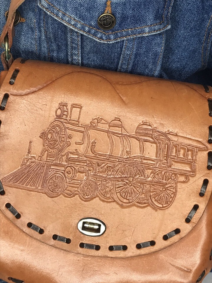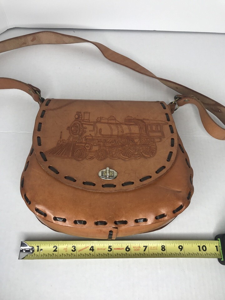 Handmade Purse Carmel Leather Unique Bag Boho 1970’s Lacing Embossed With Train