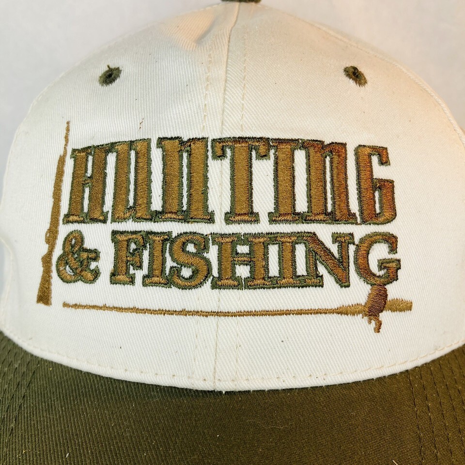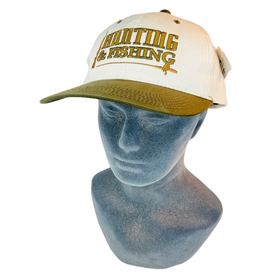 Nice cotton twill Outdoor Cap Company, Inc snapback hat with embroidered ?Hunting Fishing? spellout in front. Off white and olive green.