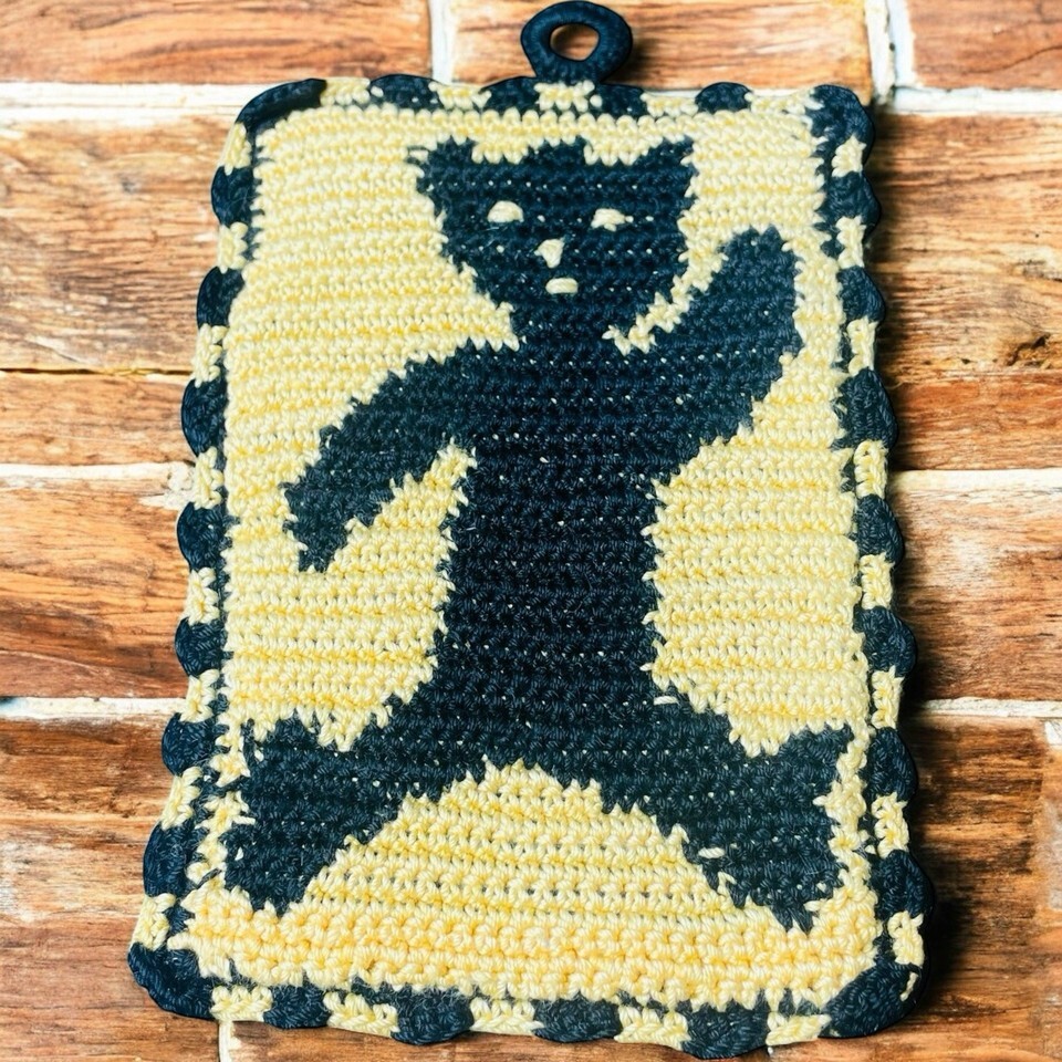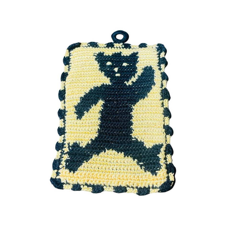 Sweet Vtg Homespun Handmade Crocheted Black Tan Teddy Bear Potholder