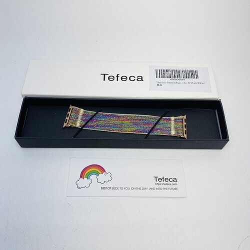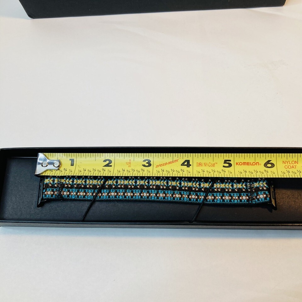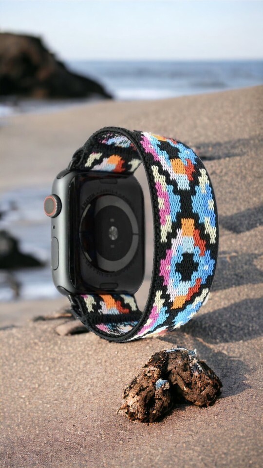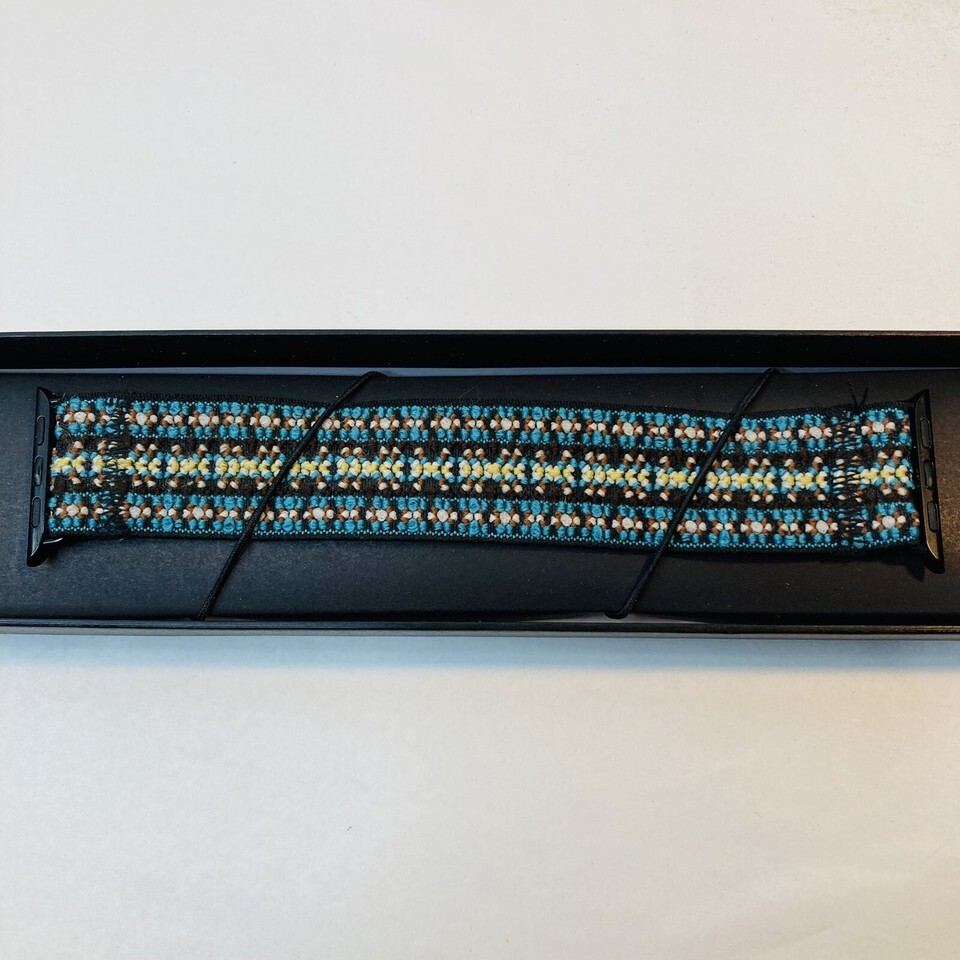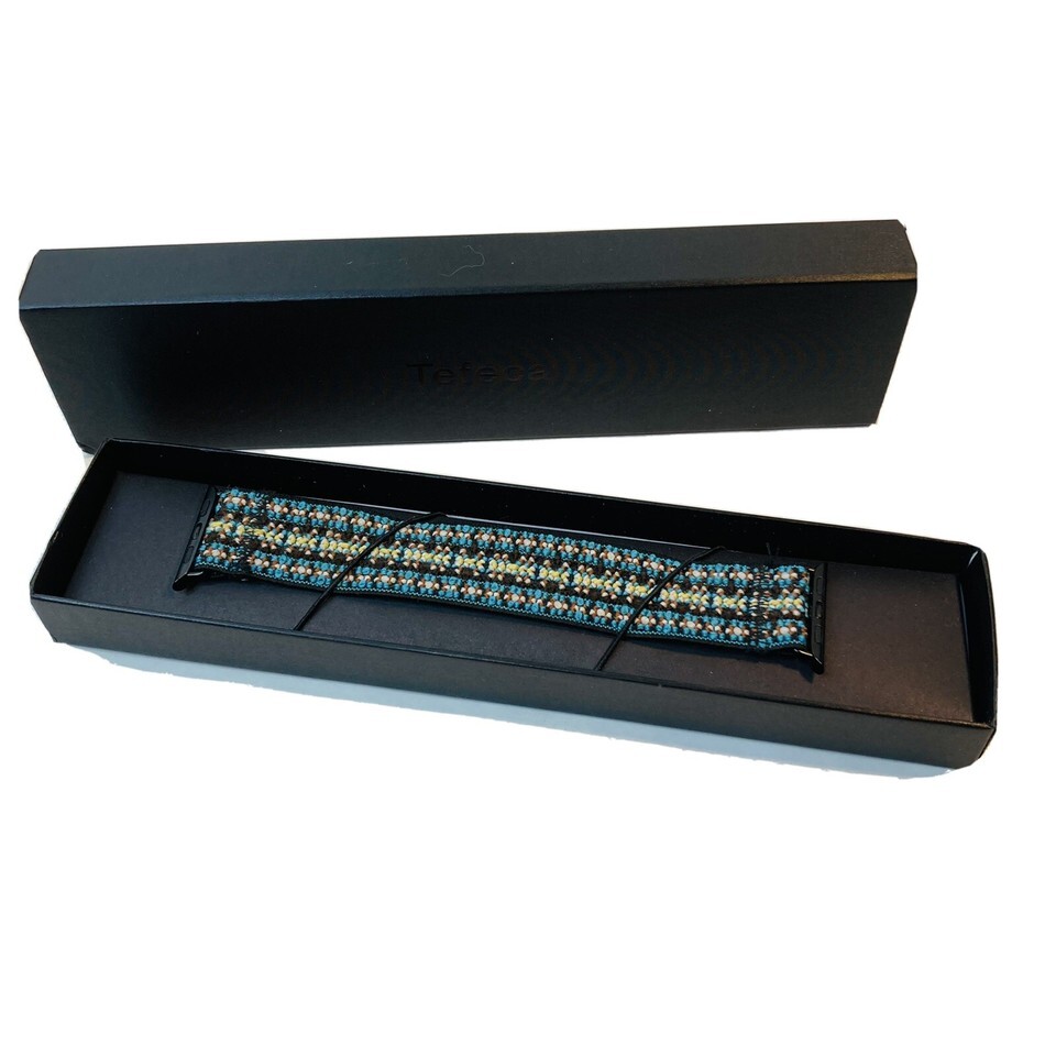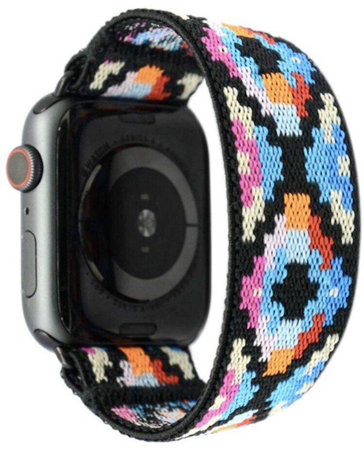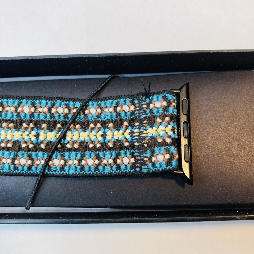 Attractive and comfortable stretch band by Tefecta- compatible with the Apple Watch. This one is 38mm L4. Black, teal, red, yellow, and white woven stretch fabric with black attachments for the Apple Watch. Comfortable to wear while hiking, working out, or all day!
