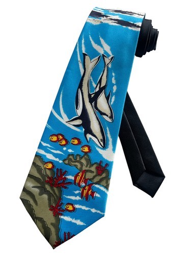 Tie depicts killer whales and colorful fish under the vast ocean