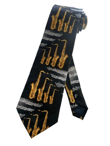 Necktie portrays an alto saxophones and white music note scores on a black background. Great necktie for any sax player!