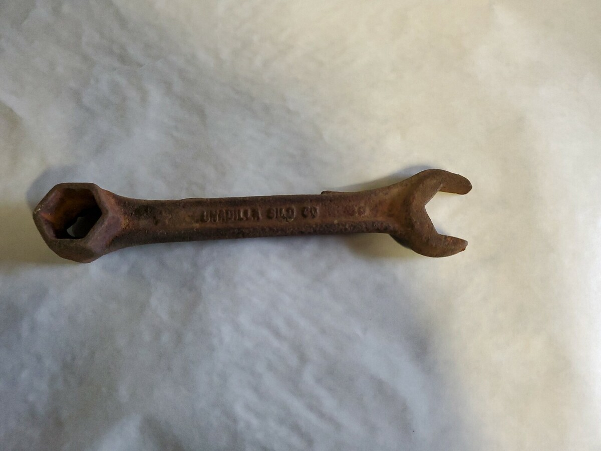 Vintage Combination wrench has Unadilla Silo Co. on it one end is open the other end is hex one one side and square on the other