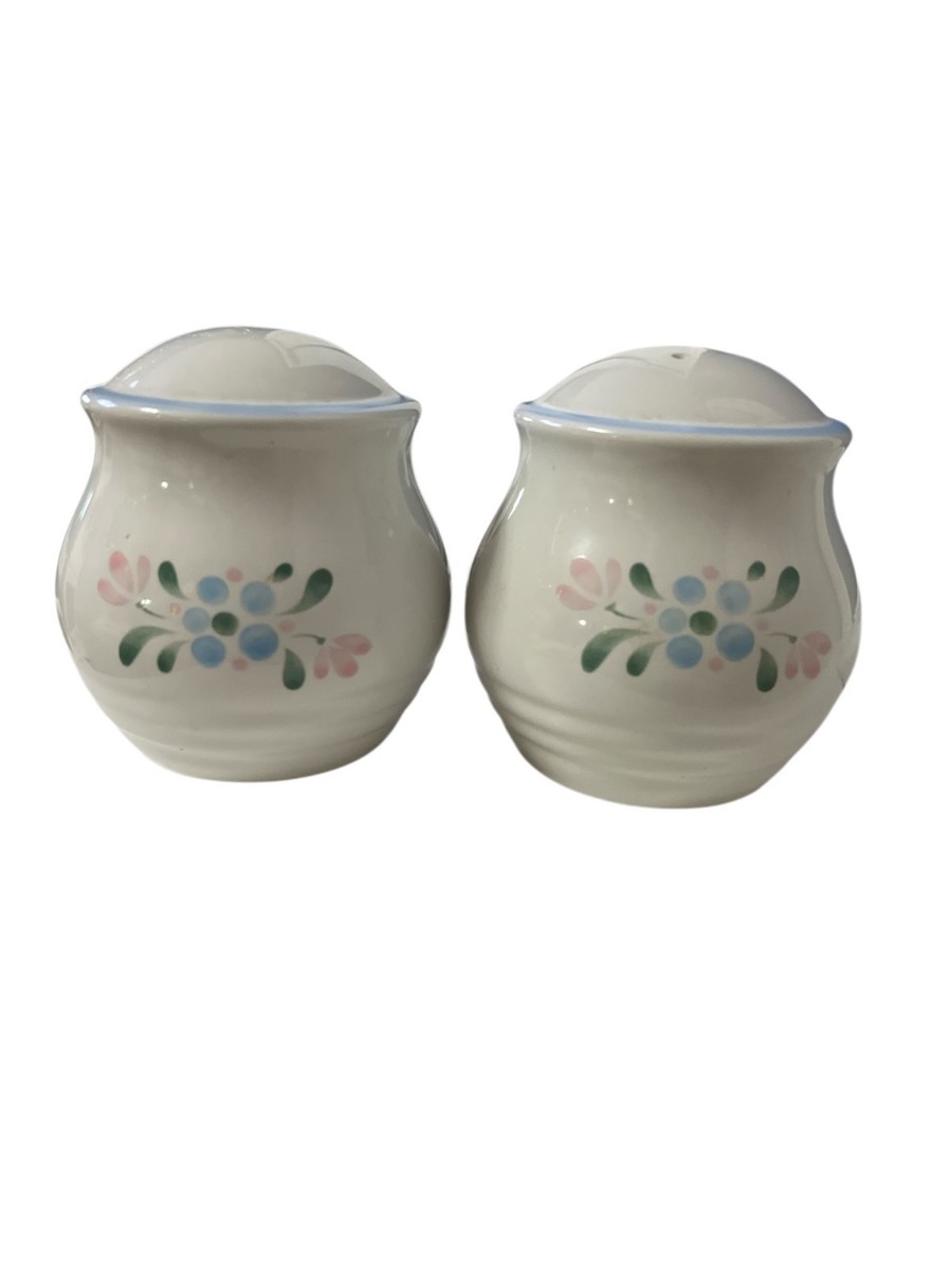 Vintage ceramic salt and pepper shaker set by Fascina, made in Japan. Each shaker features a soft cream glaze with hand-applied pastel floral motifs and a light blue rim. Classic rounded shape with a smooth glossy finish. A charming vintage kitchen or dining accent.