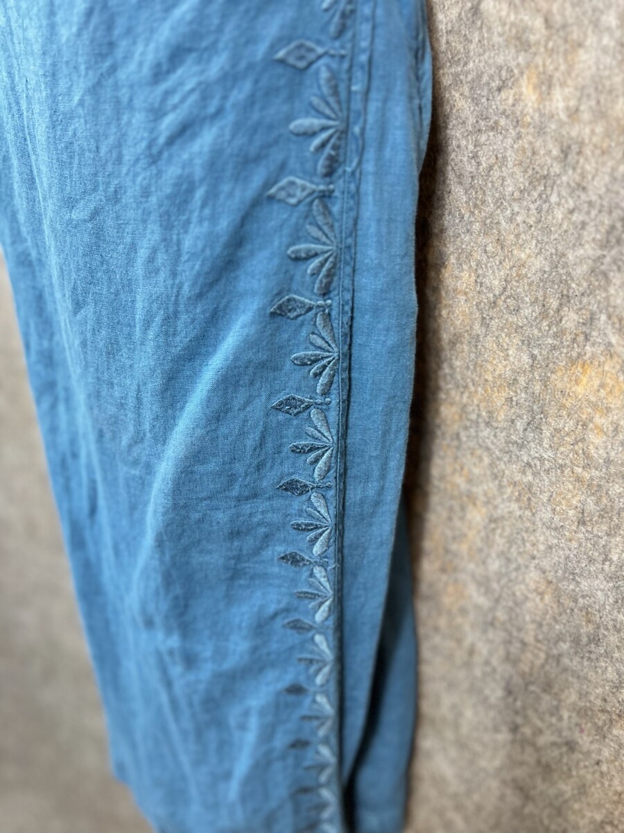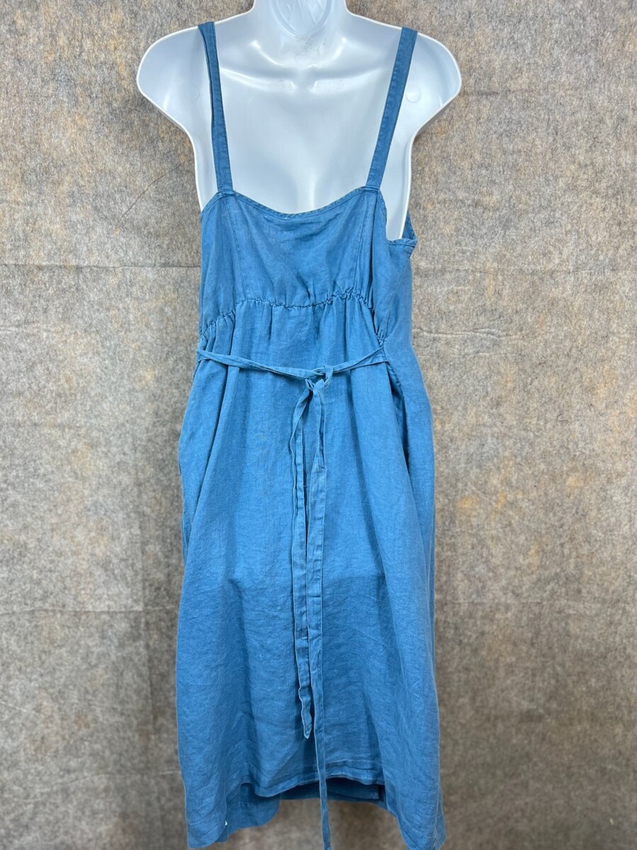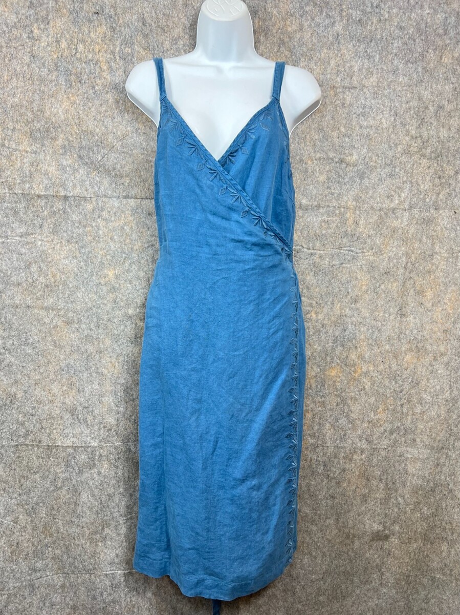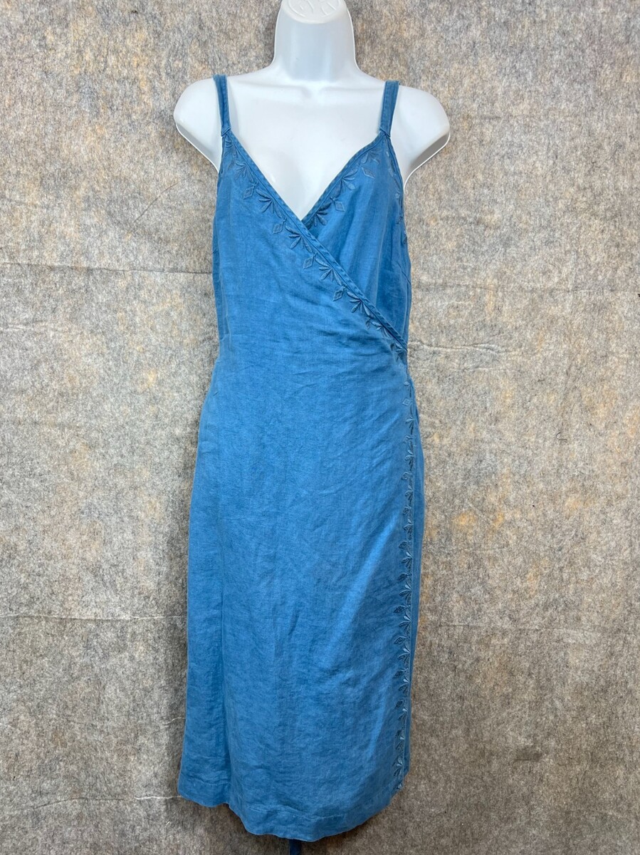 Artisan NY Blue Linen Wrap Midi Dress Embroidered Vintage Look Spaghetti Strap US 6