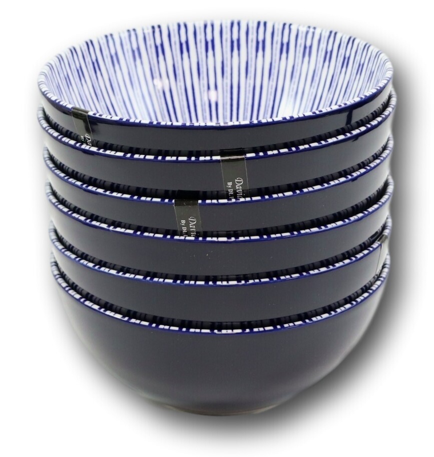 ? Featuring a delicate interior blue and white design, the traditional aesthetics of these bowls make them beautiful additions to any table. A gorgeous accent piece set when paired with white ceramic tableware, the charming blue stripes adorn the interior and upper portion of of the bowl rim, leading to a darker blue/black exterior for added visual charm.