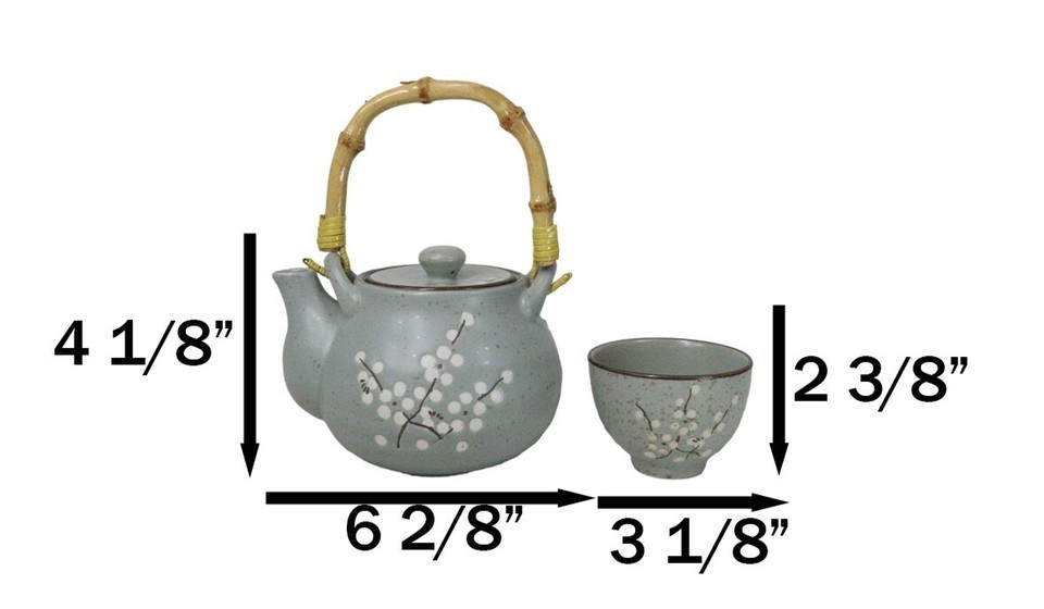 ? This Beautiful Japanese Sakura Cherry Blossoms Porcelain Tea Pot set serves four people, containing 1 teapot(27 floz) with built in strainer spout and bamboo handle, 4 tea cups (5 floz). Teapot comes with stainless steel strainer.