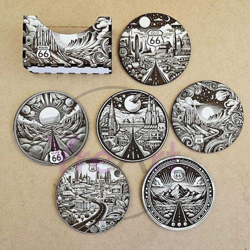 Celebrate the spirit of the open road with this handcrafted Route 66 coaster set, featuring 6 unique wooden coasters engraved with classic symbols of America?s most iconic highway. From vintage cars to road signs, each piece captures the freedom and nostalgia of a great American road trip.