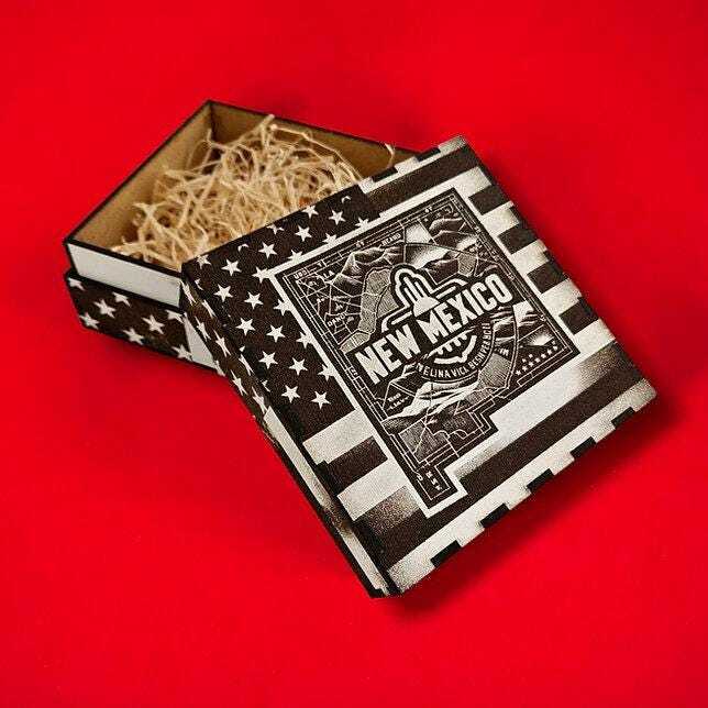 Laser-engraved wooden box with New Mexico-inspired artwork