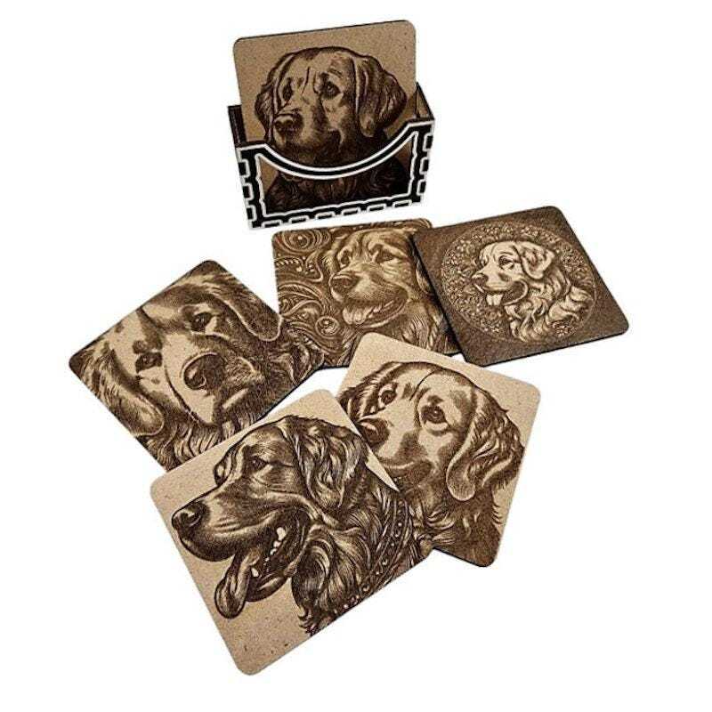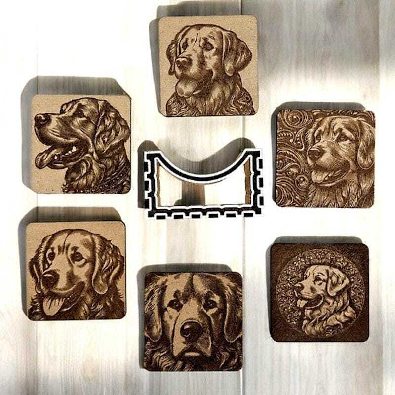 7 laser-engraved wooden coasters (Golden Retriever theme)