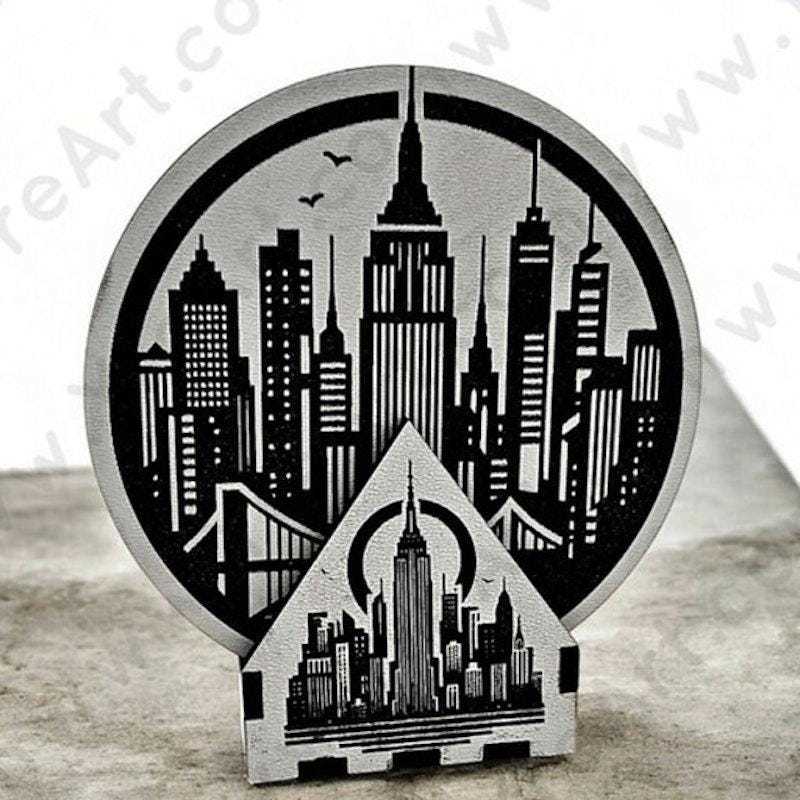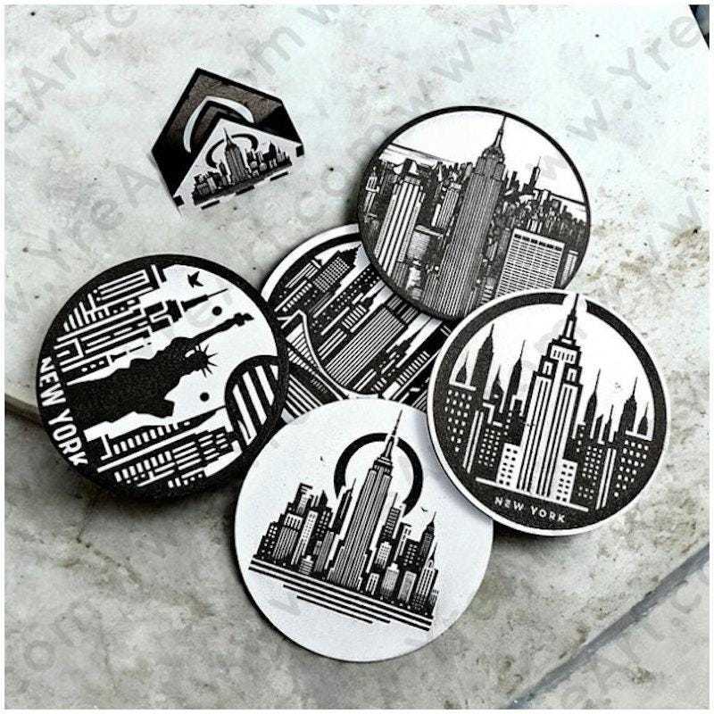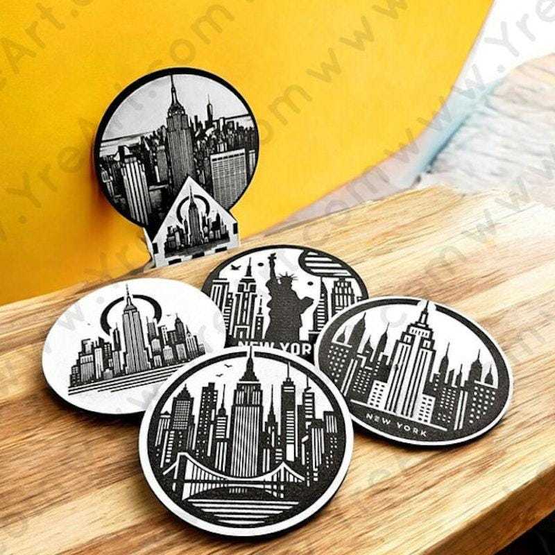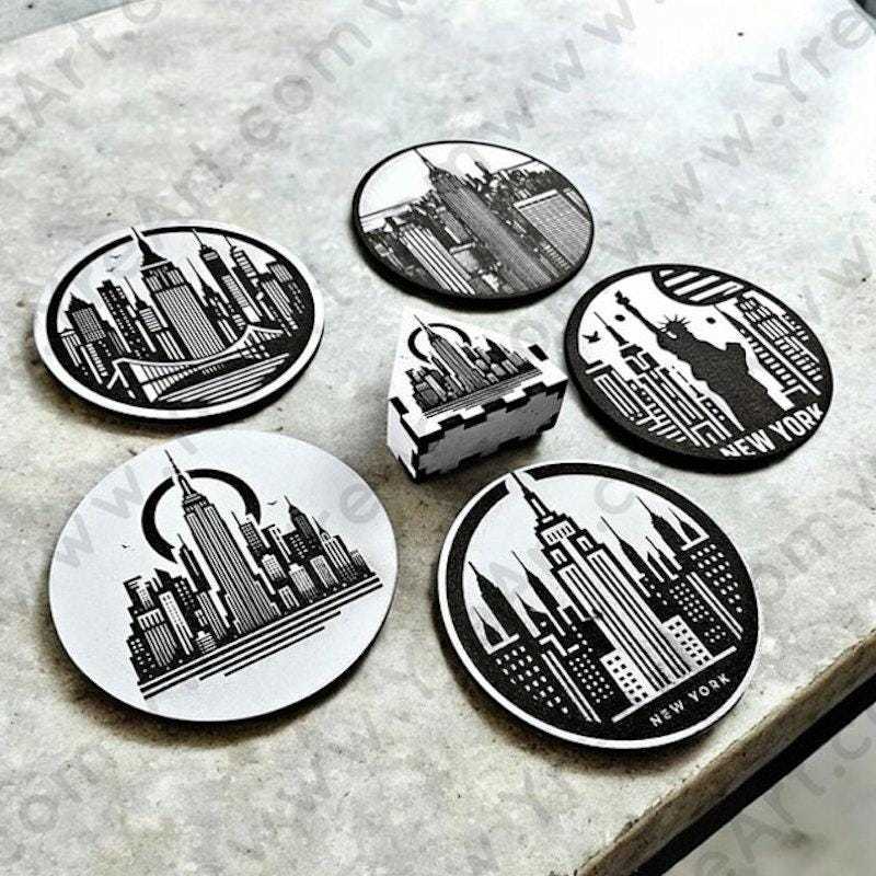 This handmade New York-themed coaster set features 5 laser-engraved wooden coasters with iconic NYC landmarks ? from the Statue of Liberty to the Empire State Building and Brooklyn Bridge. A matching wooden storage box is included, combining practicality with bold urban charm.