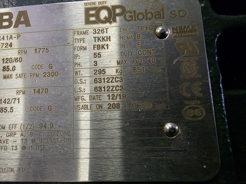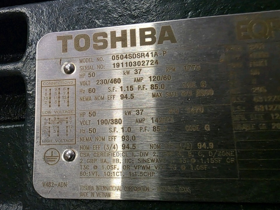 Toshiba Severe Duty EQP Global SD 50 HP 3 Phase 1775 RPM TEFC Electric Motor 326T Mod 0504SDSR41A-P Type TKKH