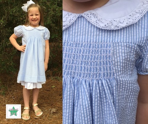 Pretty embroidery at the waist elevates this cute and classic striped seersucker dress from Rare Editions.
