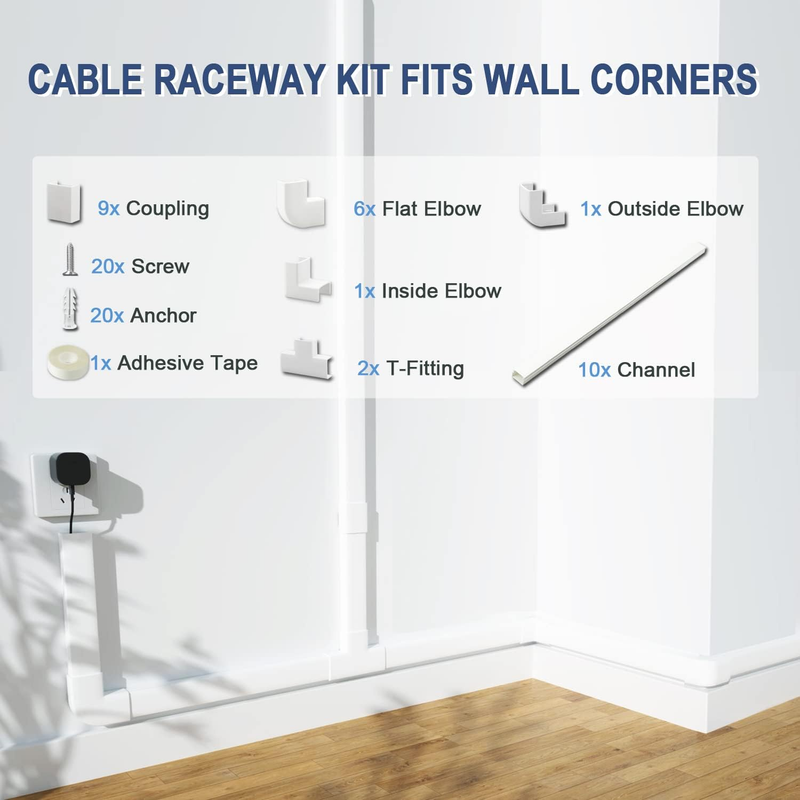 Our Cord Cover Raceway Kit includes 10 cable cover channels, 9 couplings, 6 flat elbows, 1 inside elbow, 1 outside elbow, 2 T-fittings, 20 screws, 20 anchors, and 1 adhesive tape. If there are any problems with our cord concealer, please feel free to contact us. We will do our best to ensure that you receive the best products and services.