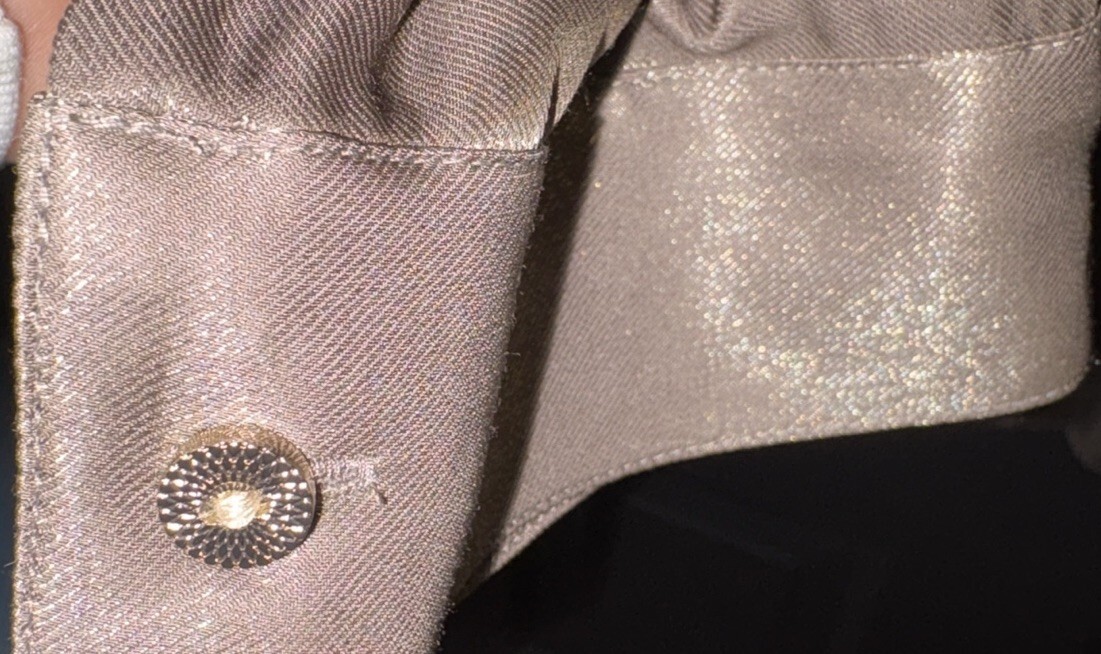 I would describe this color as a metallic tan Has gold buttons