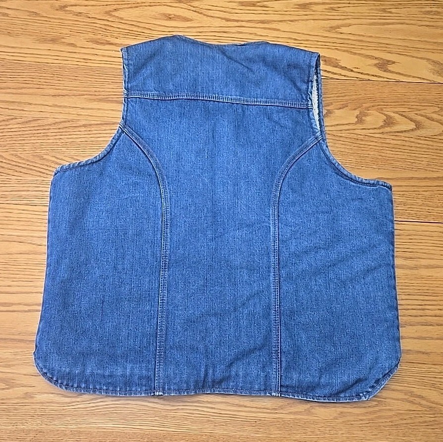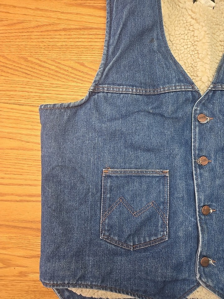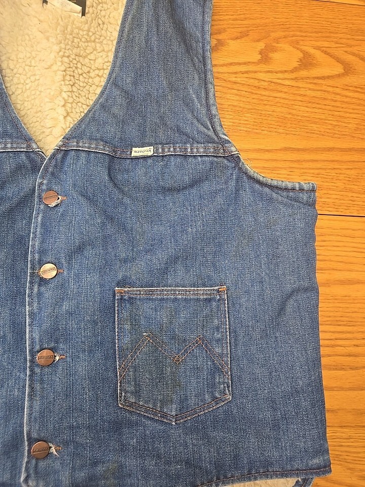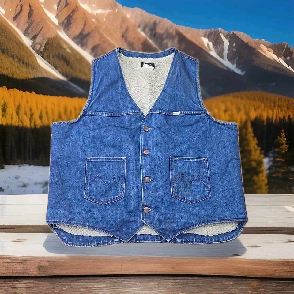 The Maverick Automaticks Vintage 70s Sherpa Lined Denim Vest is a stylish and functional piece perfect for casual or workwear occasions. This XL vest features a button closure, denim fabric with polyester lining, and a solid blue color with a logo accent. Designed for winter, fall, and spring, this short-length vest with a western theme is great for activities like walking, hunting, or hiking. Made in the United States, this Maverick vest is a unique addition to any wardrobe, combining a touch of retro style with practical winter warmth.