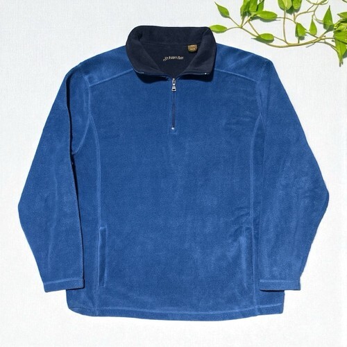 This vintage St. John's Bay fleece pullover from the 90s is a classic piece of men's activewear in size Large. The pullover features a solid blue color, long sleeves with a 1/4 zip closure, and a collared neckline for added style. Made of polyester fleece, this pullover is machine washable and perfect for outdoor activities like hiking, cross training, and gym workouts. With its retro vibe and outdoor theme, this pullover is sure to keep you warm and stylish during the winter, fall, and spring seasons.