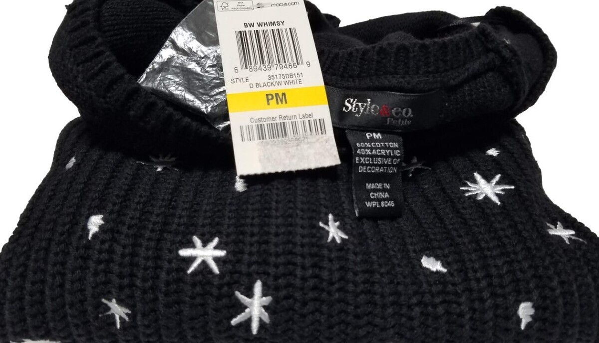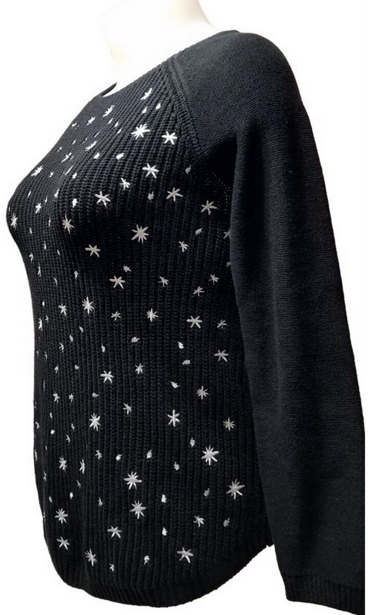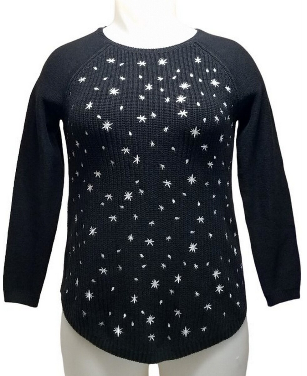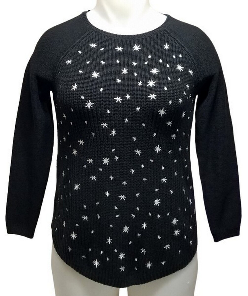 Style & Co Black White Embroidery Star Petite Whimsy Pullover Sweater (M) NWT