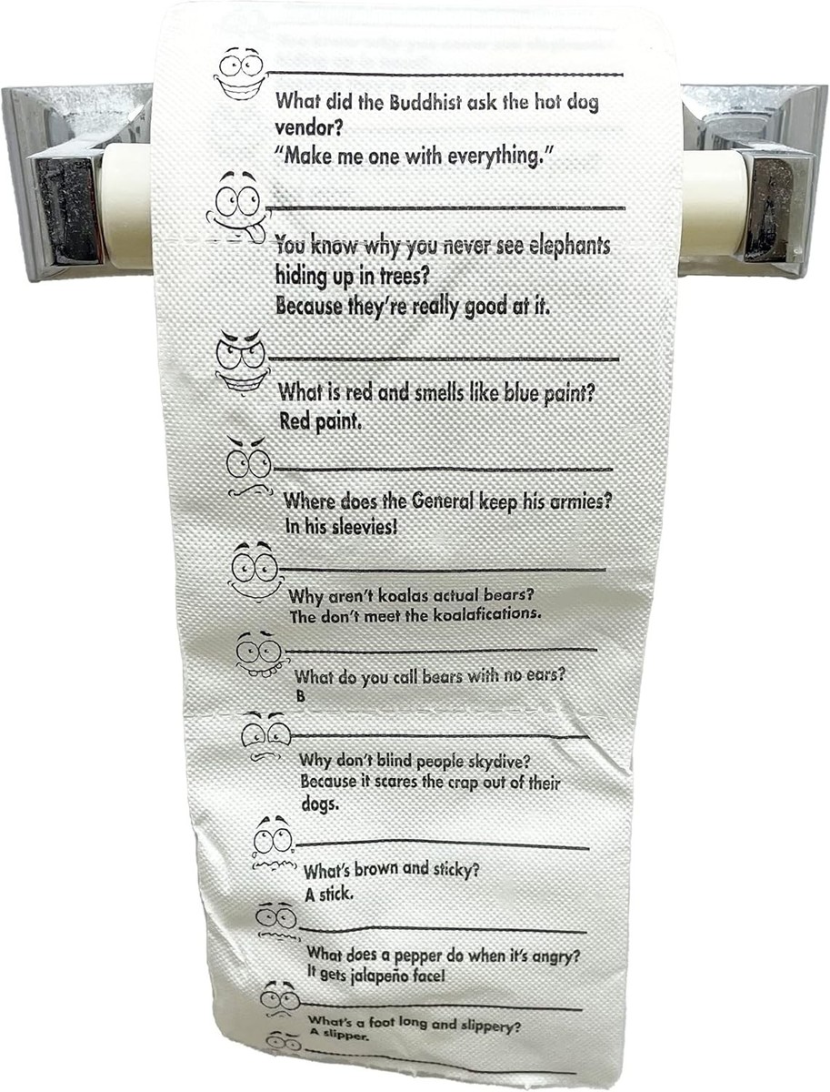 Laugh your way through the bathroom break with Crap Jokes Toilet Paper! Perfect for a gag gift or for spicing up your own bathroom, this 3-ply novelty toilet paper has septic-safe jokes printed right on it! Make your bathroom time fun and funny with Crap Jokes Toilet Paper! Number of different jokes may vary and may also possibly repeat.
